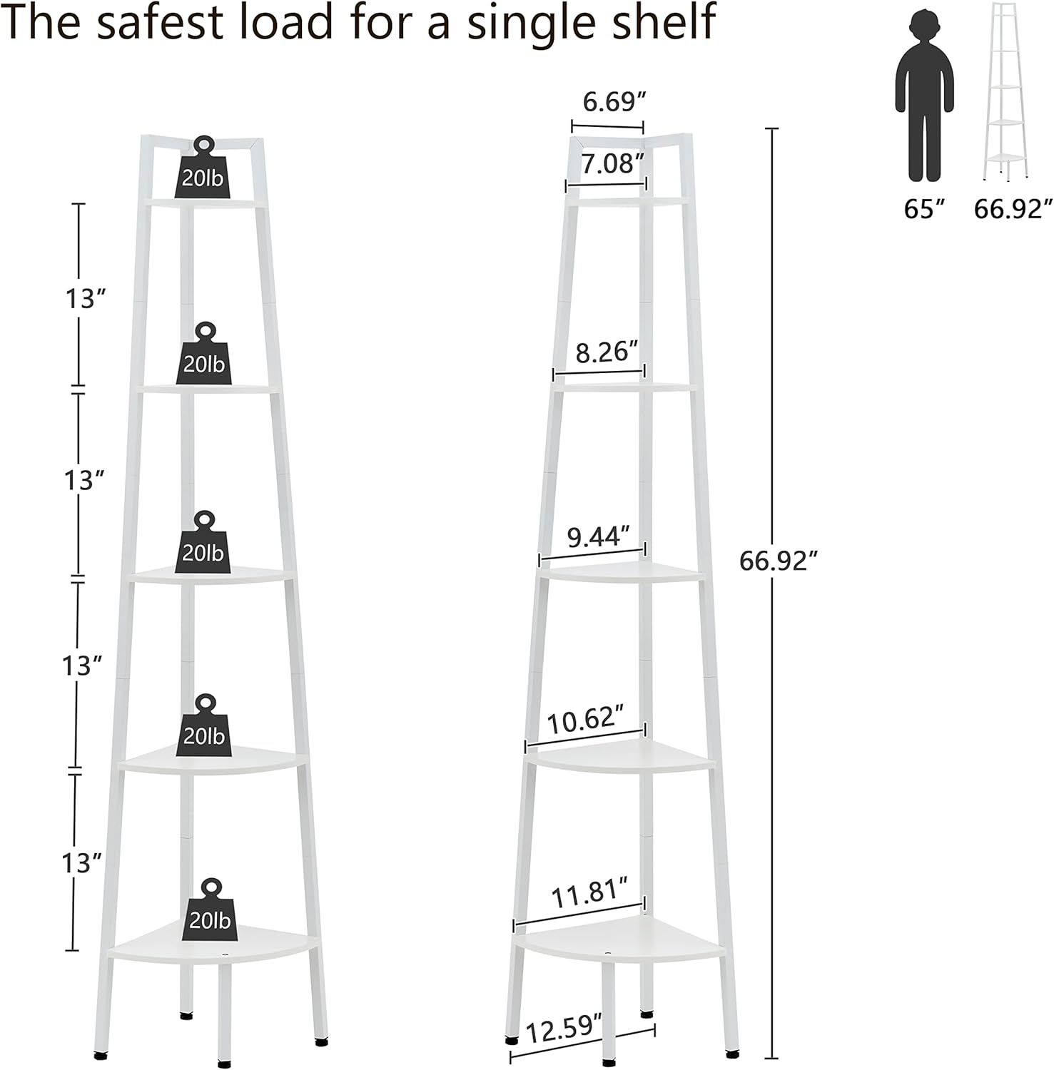 Hoctieon Corner Shelf, 5-Tier Corner Bookshelf, Rustic Ladder Shelf, Industrial Display Stand for Living Room, Kitchen, Home Office, Balcony, Small Space, Metal Frame, White