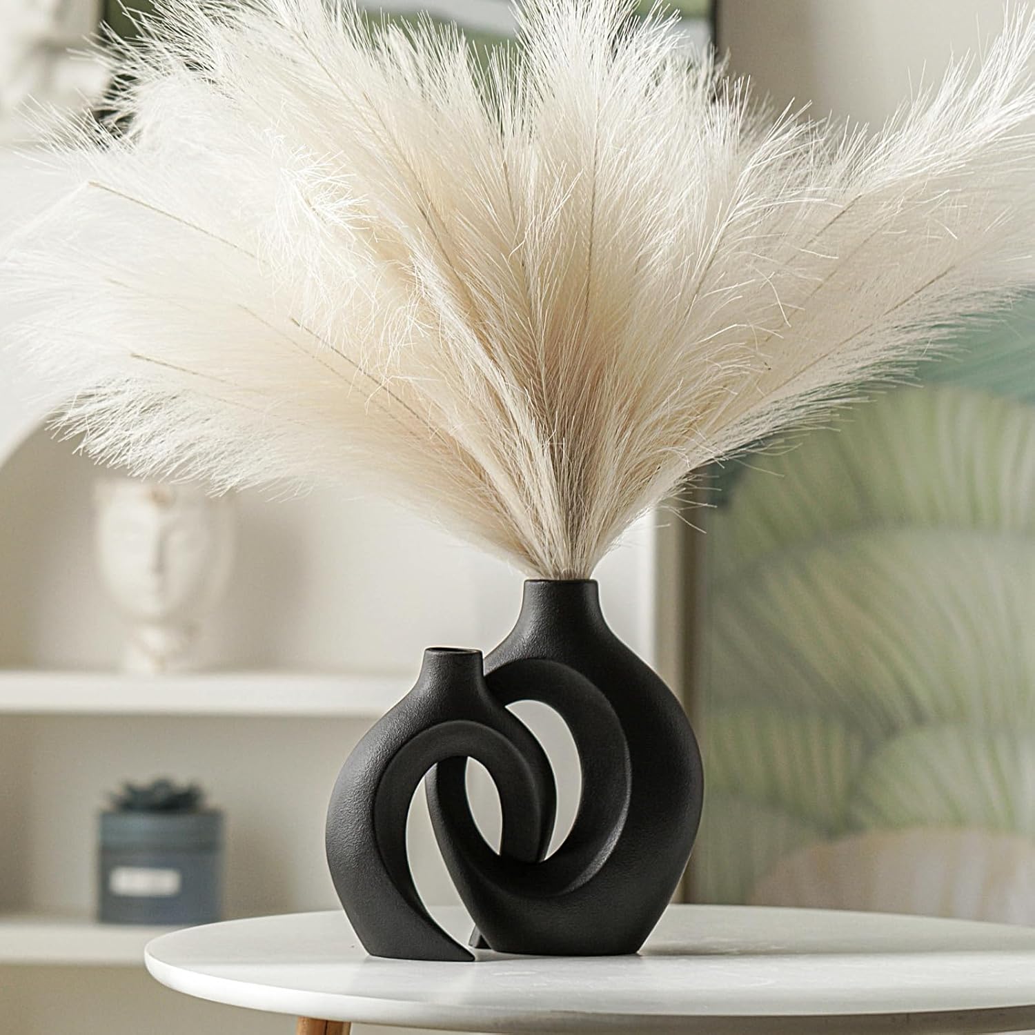 Snuggle Hollow Modern Ceramic Vase Set of 2, Mid Century Nordic Aesthetic Decorative Vase Decorative Vases for Home Table Decor (Matte Black W 6.3" X H 8.4")