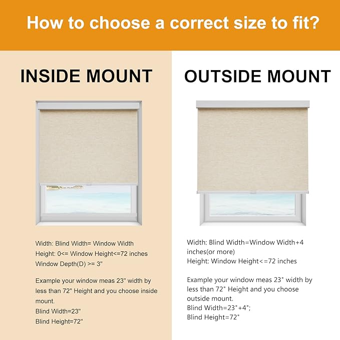- 【How to choose a correct size to fit? Example your window meas 23" width by 72" length】INSIDE MOUNT: window width is blind width, window height is blind height; Blind Width=23"; Blind Height=72"; OUTSIDE MOUNT: Plus at least 4" is blind width, plus at least 4" is blind height; Blind Width=23"+4"; Blind Height=72"+4";【Pls Note】Fabric width will be 0.8" shorter than the size of the shade.