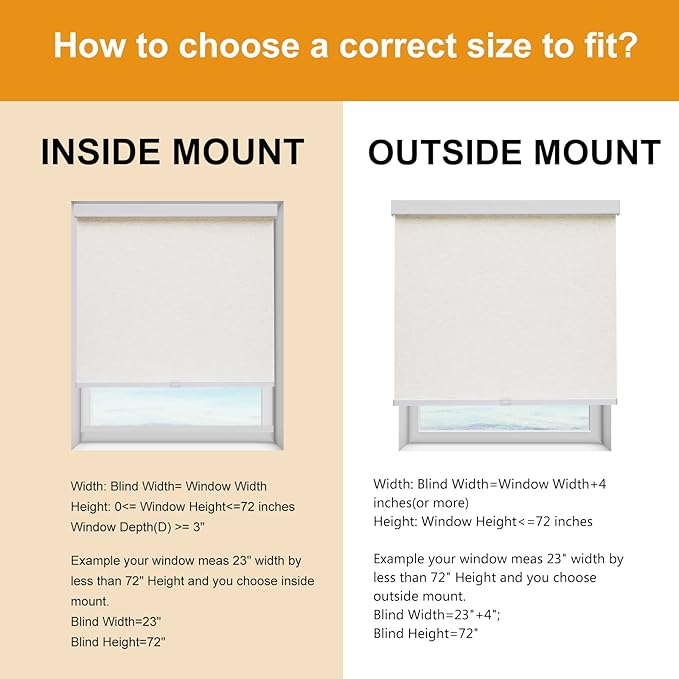 - 【How to choose a correct size to fit? Example your window meas 23" width by 72" length】INSIDE MOUNT: window width is blind width, window height is blind height; Blind Width=23"; Blind Height=72"; OUTSIDE MOUNT: Plus at least 4" is blind width, plus at least 4" is blind height; Blind Width=23"+4"; Blind Height=72"+4";【Pls Note】Fabric width will be 0.8" shorter than the size of the shade.