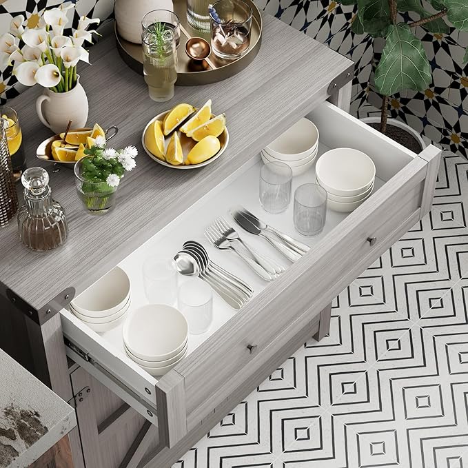 - [Ample Storage Space]: The kitchen storage cabinet has a large drawer and two-door cabinet with an adjustable shelf to meet your storage needs for coffee beans, condiments and some miscellaneous items, while the wide tabletop can hold a microwave and coffee maker.