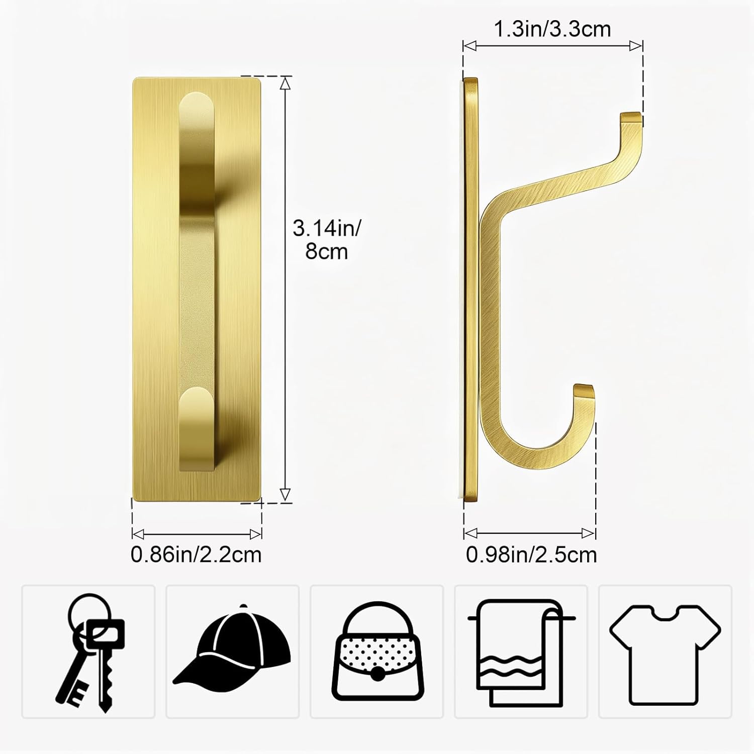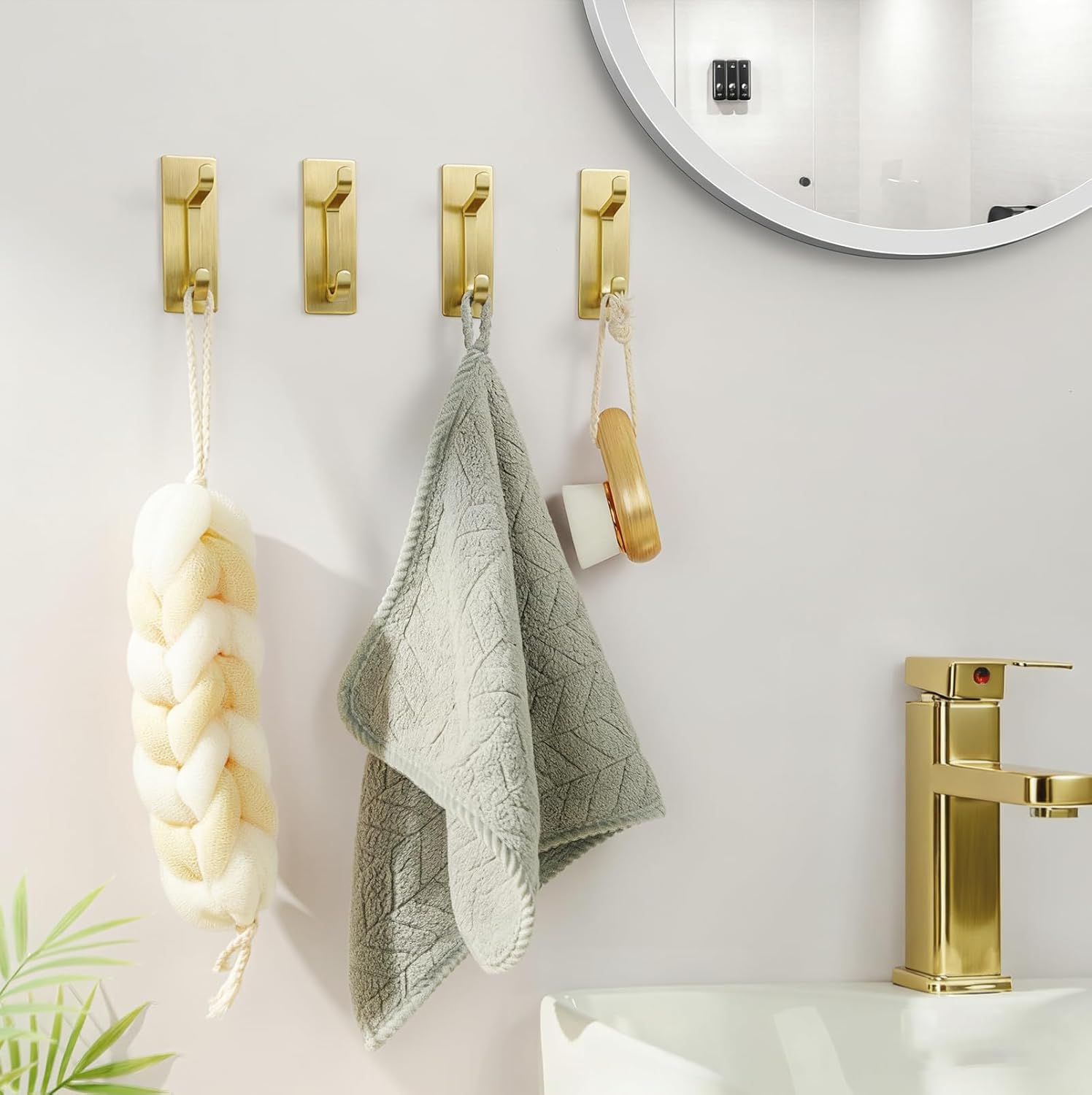 pickpiff Self Adhesive Hooks, Extra Sticky 10LB (Max), Heavy Duty Stainless, Stick On Wall and Door Hooks for Hanging, Bathroom Towel Hooks and Coat Hooks, Robe Hook Wall Mounted, Gold, 4 Pack