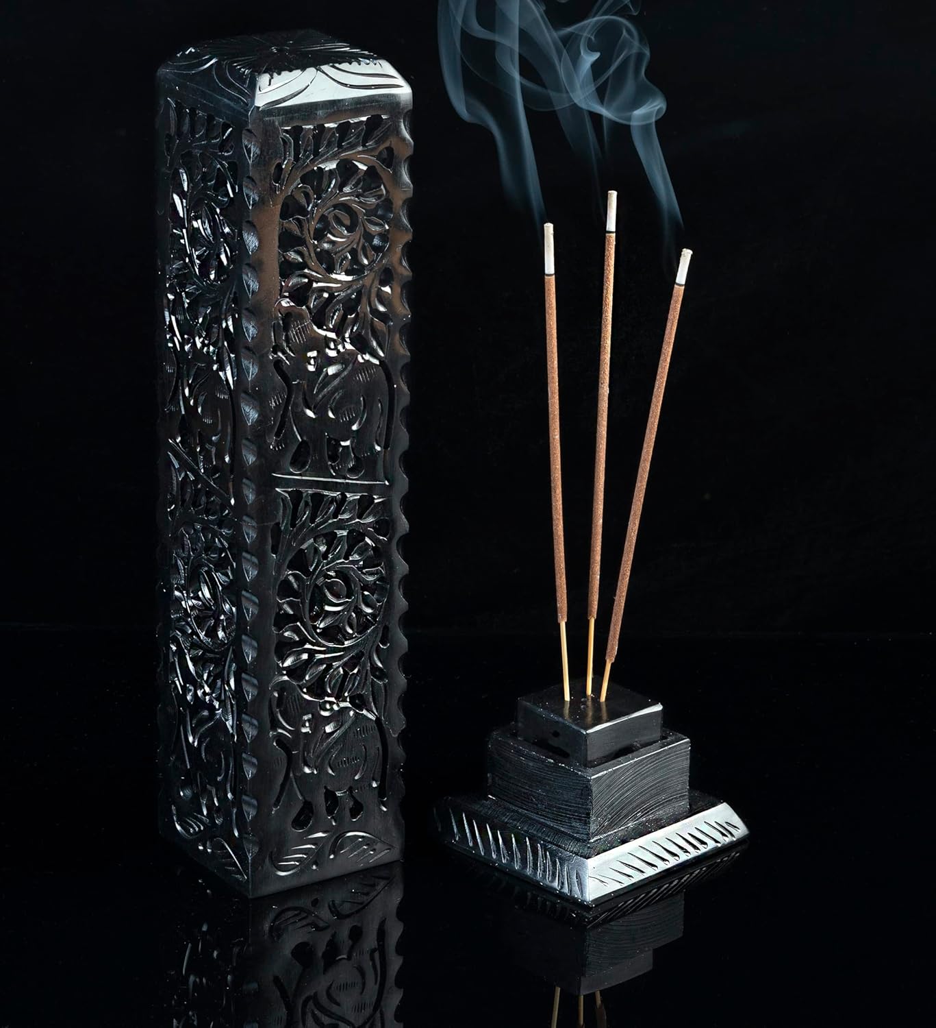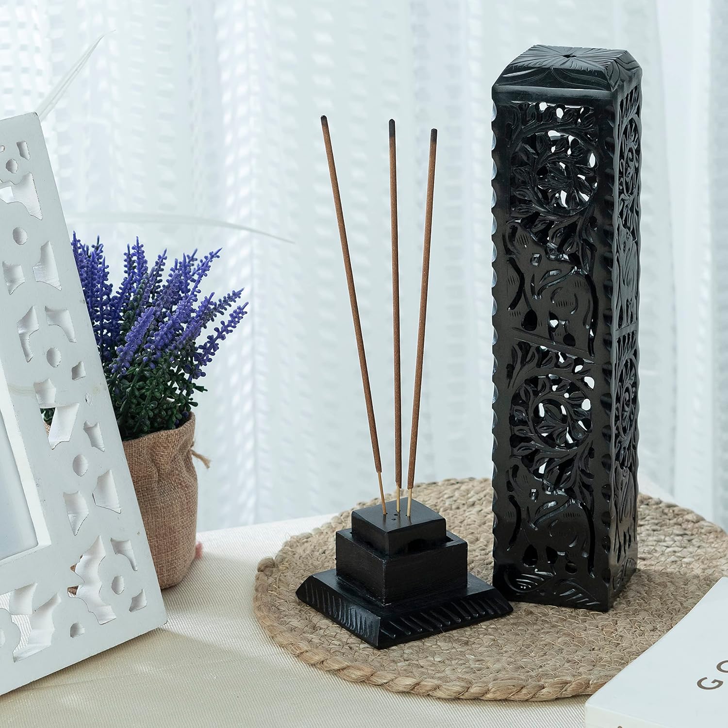 - ⨠MARBLE SOAPSTONE INCENSE BURNER : This attractive handmade black marble soapstone incense stick burner square shape leaf & half wheel carving tower burner marble soapstone incense and candle holder handmade in INDIA, incense and spirituality. Size of the burner in Inch 3X3X11 Inch, lxwxh (8x8x28)cm. Incense can be burned during times of healing, yoga, prayer, general reflection or to help cleanse and clear the air and make a space sacred.