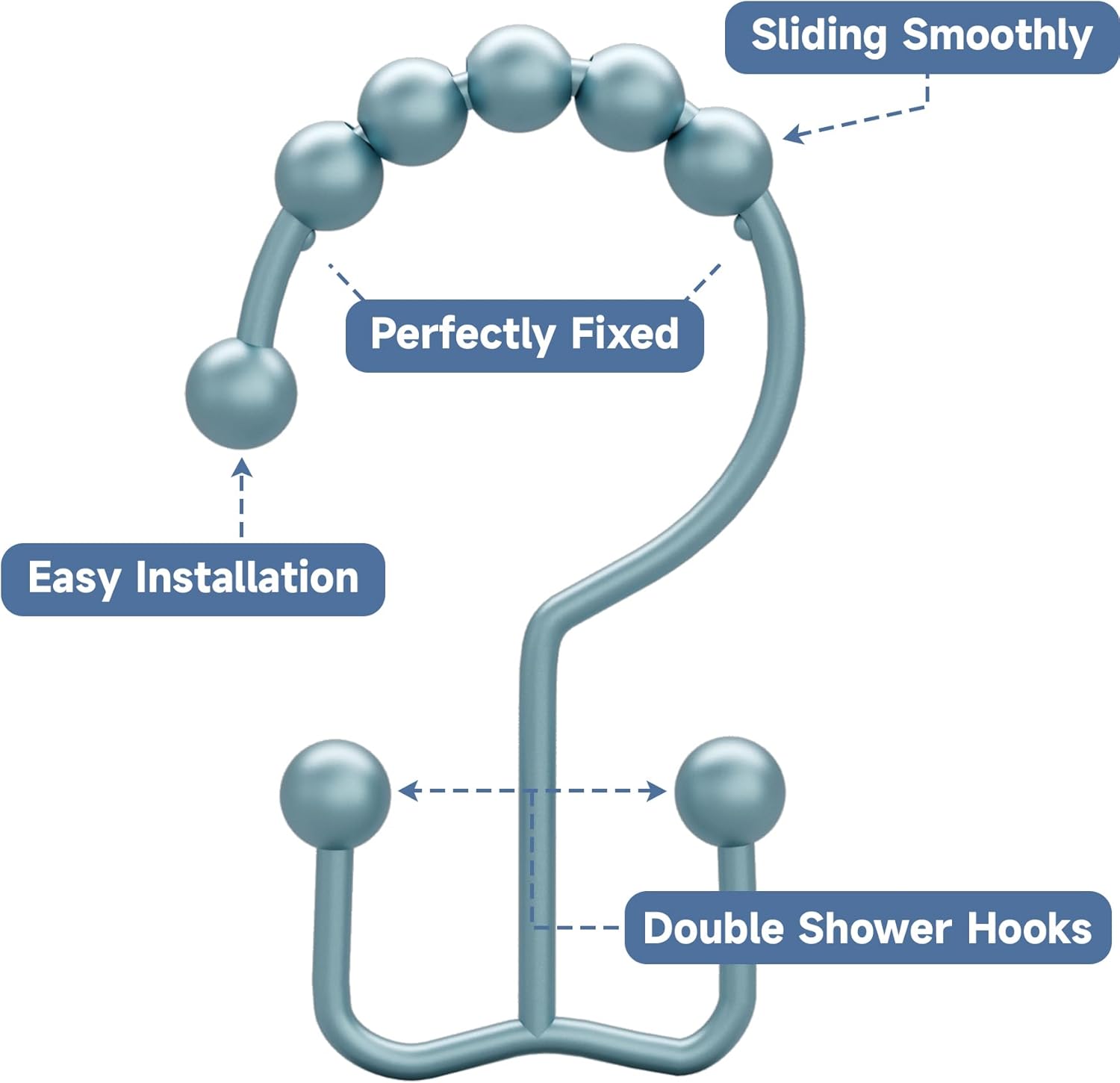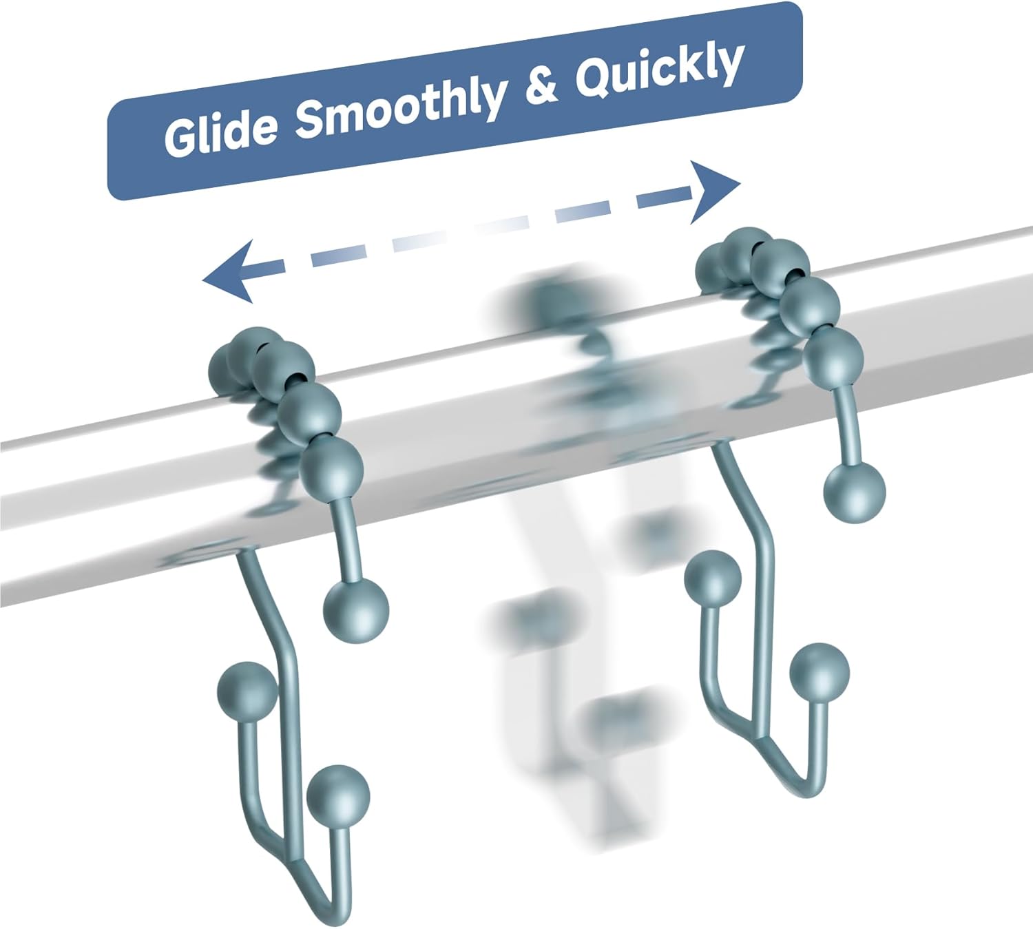 - Double hooks design - The double roller glide shower hooks are strong enough to hold up shower curtain and shower liner.