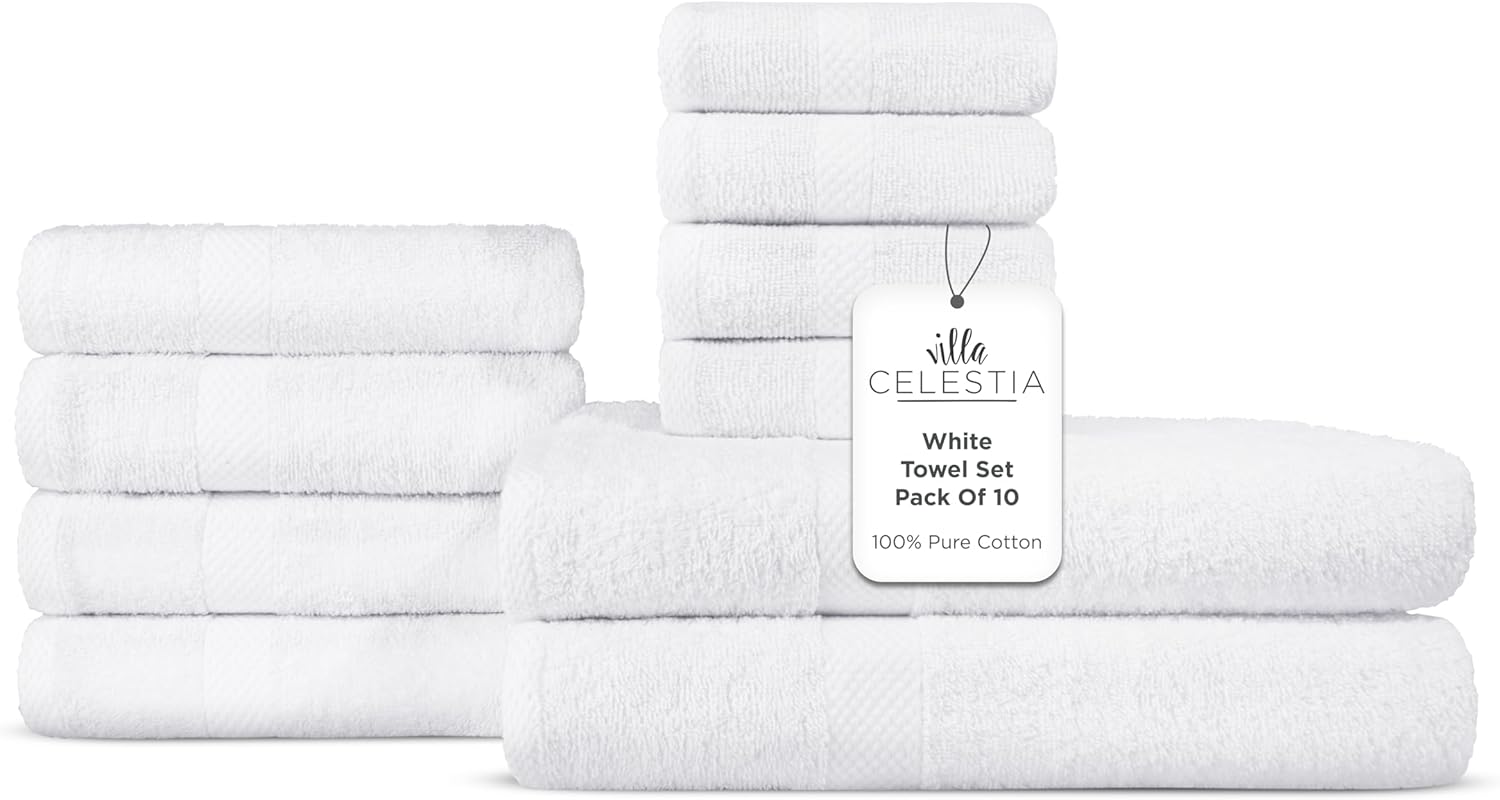 - VILLA CELESTIA LUXURIOUS TOWEL SET (PACK OF 10): Uplift your mood and bathing experience with the super soft and luxurious touch of our Villa Celestia Bath Towels Set. Bundled in a 10 pack design, our towel sets for bathroom consists of 2 Bath Towels (27” X 54”), 4 Hand Towels (16” X 28”), and 4 Washcloths (12” X 12”), giving you the complete package of comfort, indulgence, and delight.