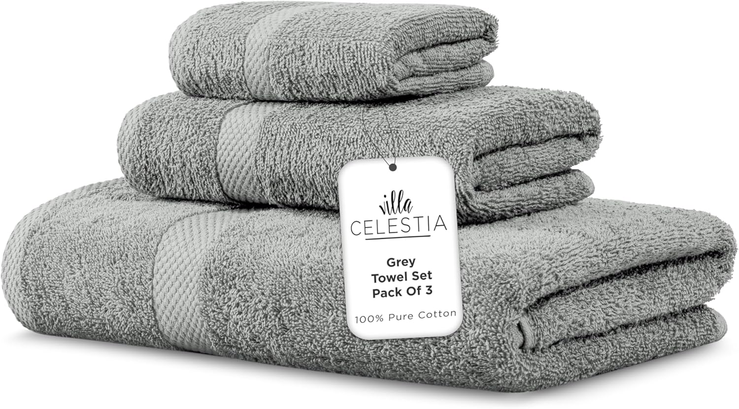 100% Combed Cotton Bathroom Towel Set of 3- 1 Bath Towel, 1 Hand Towel, 1 Wash Cloth, Sustainable, Soft, Highly Absorbent 3 Piece Cotton Bath Towel Set Ideal for Hotels, Spa, Bathroom, Dorm, Grey