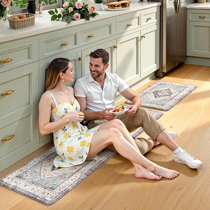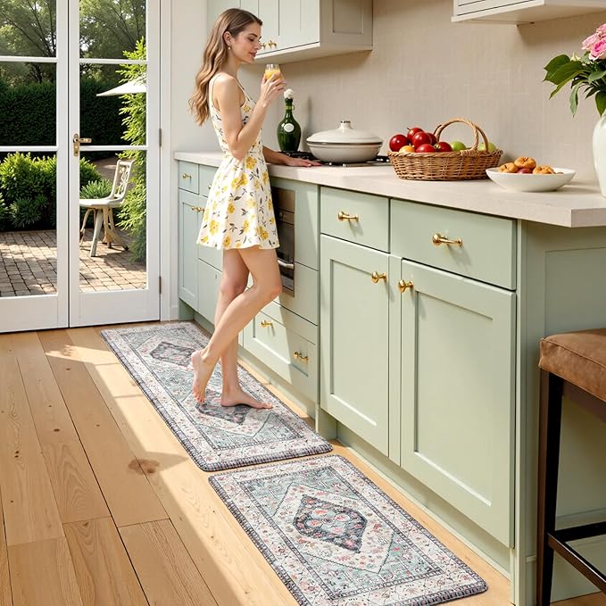 - Versatile: Vintage farmhouse style kitchen rug design features a central medallion and floral motifs in the style of Oriental rugs,easily to match your kitchen decor,bright your home.Soft thick foam provides ample support for standing in kitchen sink,laundry room, office,bathroom,dinning room,or any other high-traffic area