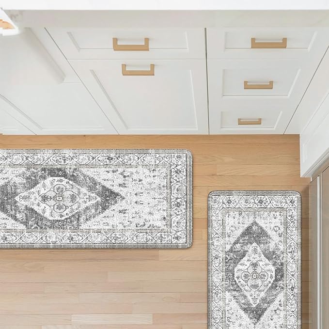 - Versatile: Vintage farmhouse style kitchen rug design features a central medallion and floral motifs in the style of Oriental rugs,easily to match your kitchen decor,bright your home.Soft thick foam provides ample support for standing in kitchen sink,laundry room, office,bathroom,dinning room,or any other high-traffic area