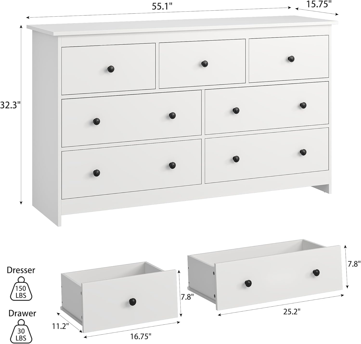 - ă55â Long & 7 Drawer DresserăWhite dresser provides an expansive top surface for displaying decor, photos, and plants. Measuring 55.1"W x 15.7"D x 32.3"H. It also features three small drawers and four large drawers, perfect for organizing clothes, books, and more, ensuring your room stays tidy and organized.
