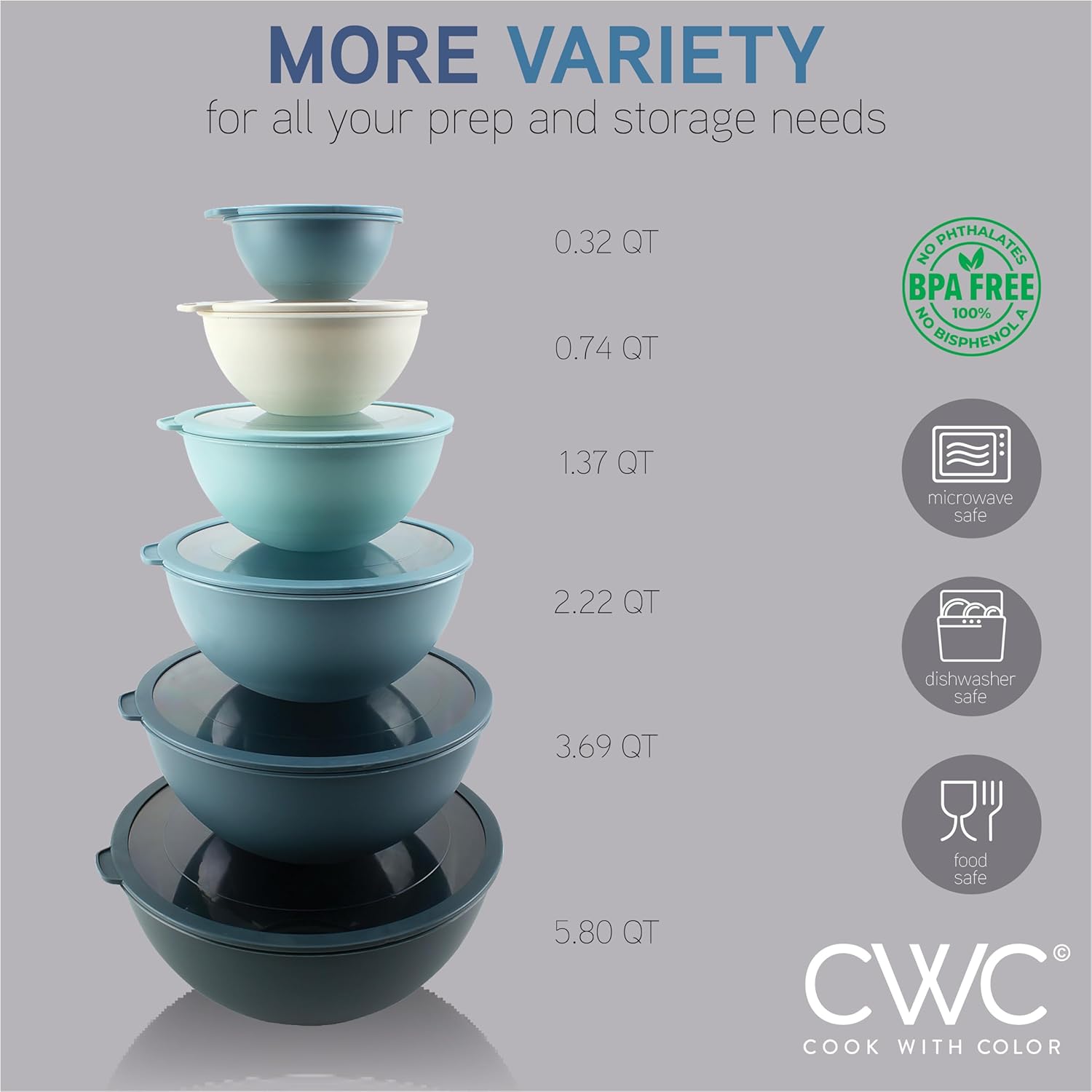 COOK WITH COLOR Mixing Bowls with Non Slip Bottom - 12 Piece Plastic Nesting Bowls Set includes 6 Prep Bowls and 6 Tritan Lids - Microwave Safe (Blue)