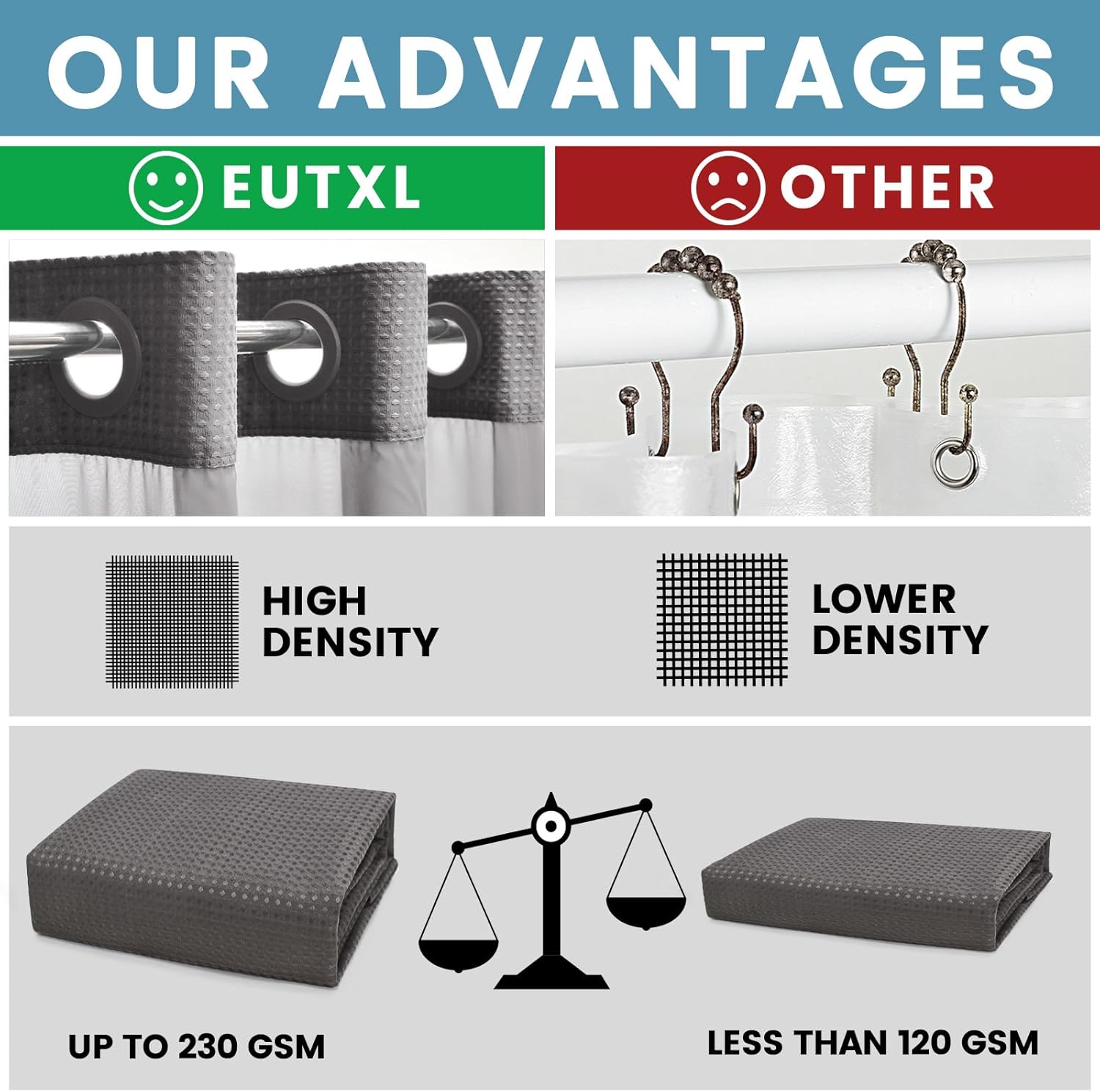 - 【Thick "Cotton" Type Fabric Shower Curtain】Made from expertly chosen and tested Heavyweight Polyester Fabric, touches like a cotton feel. 230GSM (Gram Per Square Meter), about 0.8 pounds heavier than normal 90GSM fabric shower curtains; Honeycomb waffle weave pattern adds elegance to your bathroom