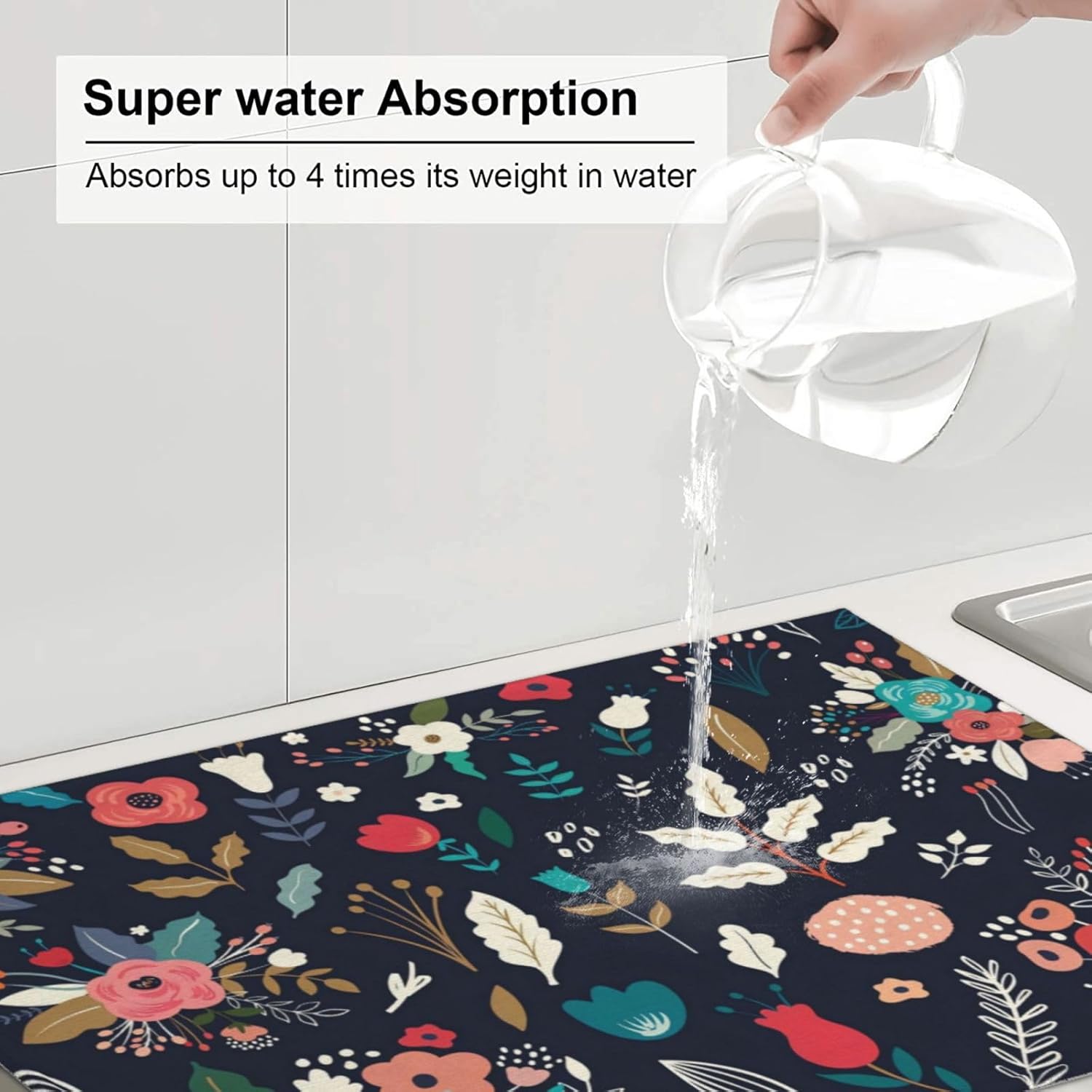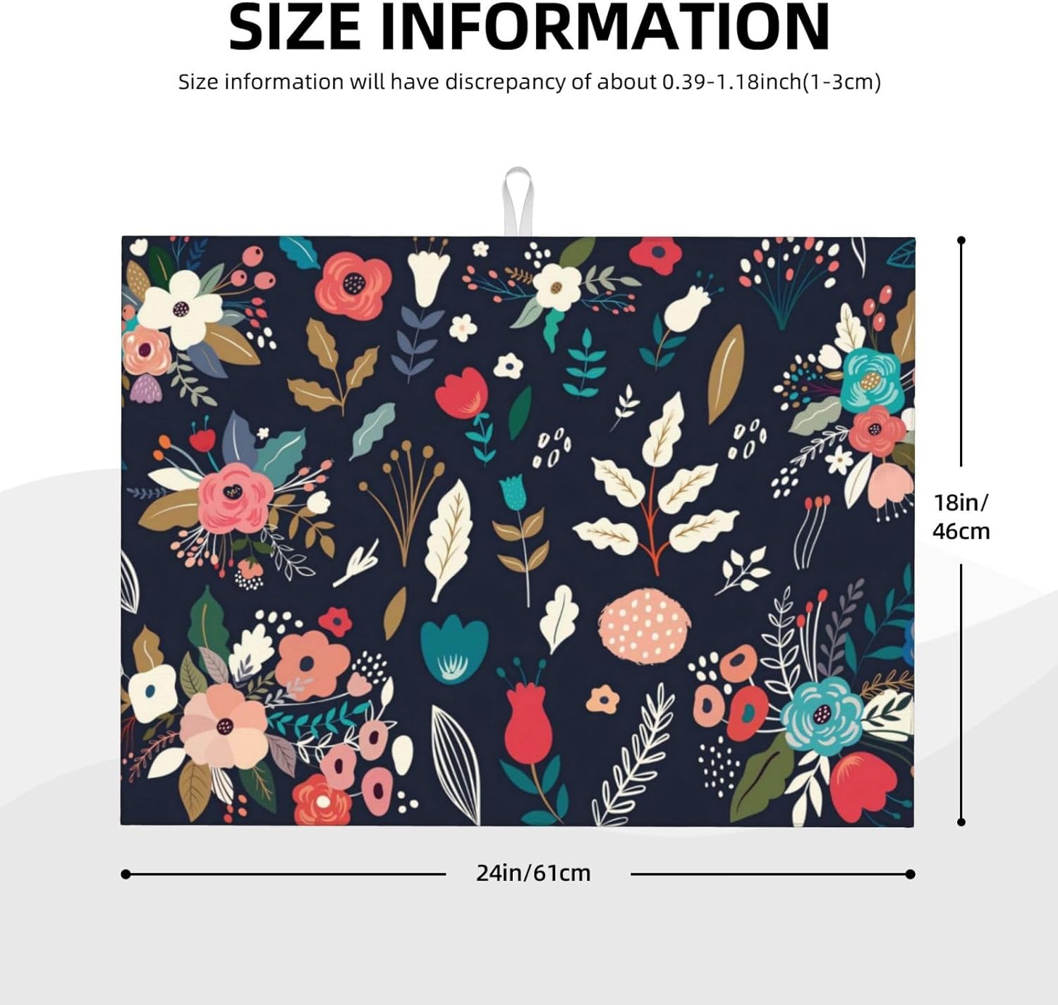 Colorful Flowers Black Dish Drying Mat 18x24 For Kitchen Counter Absorbent Microfiber Dishes Pad Dish Drainer Rack Mats Fast Dry Kitchen Accessories