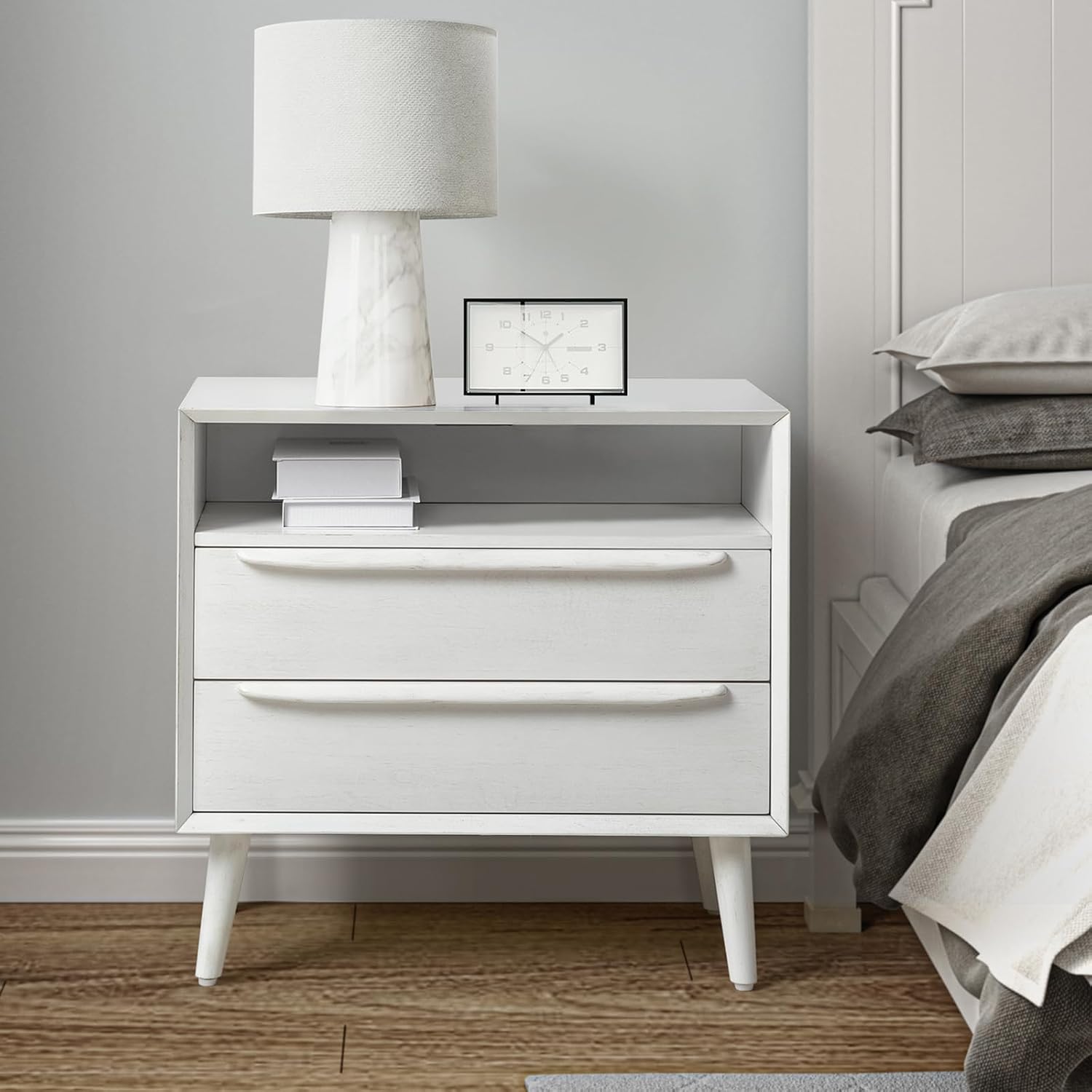 HULALA HOME Nightstand with Charging Station, Mid-Century Modern 2 Drawer and Open Shelf Dresser for Bedroom, Fluted Bedside Table, White