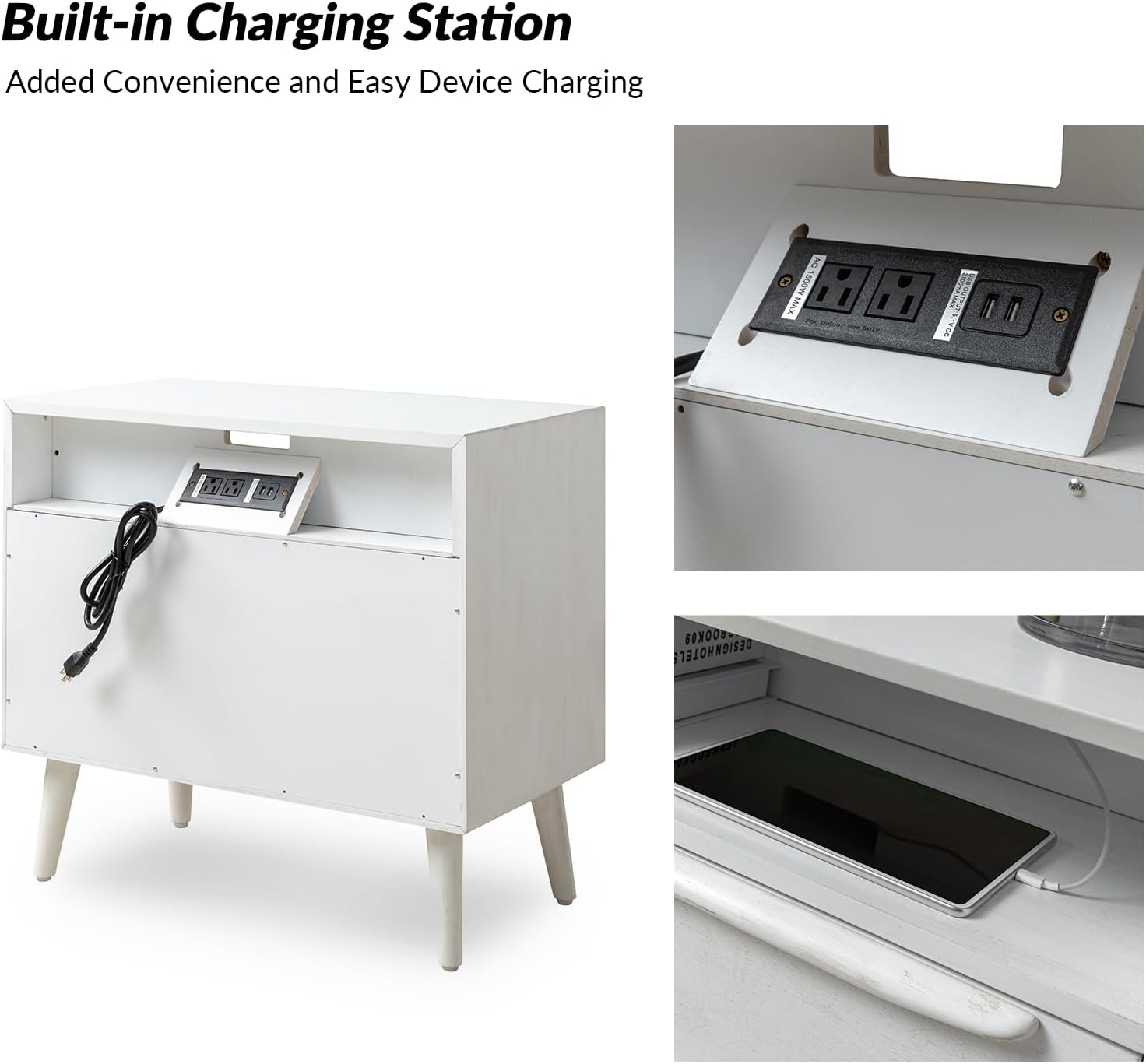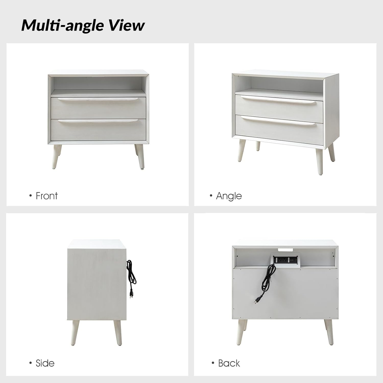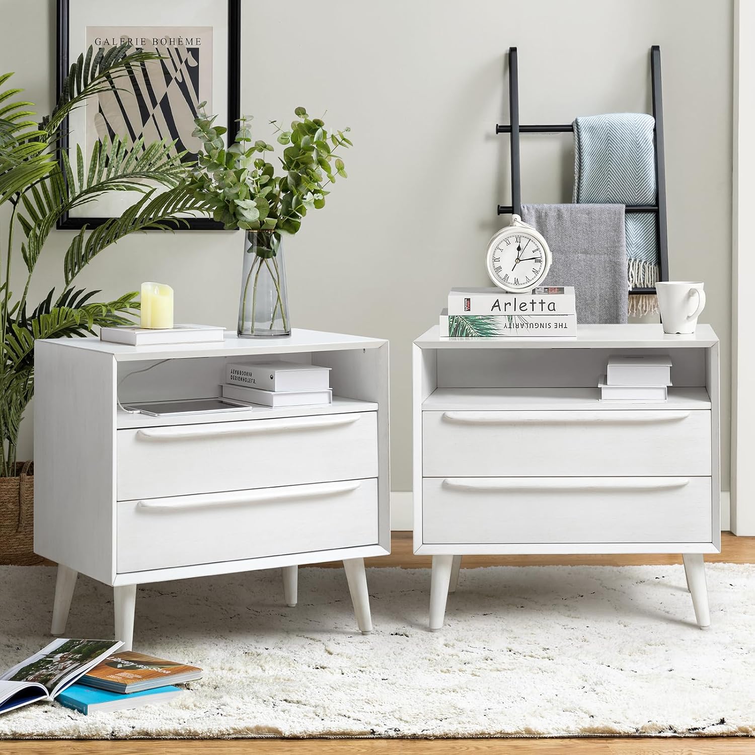 HULALA HOME Nightstand with Charging Station, Set of 2 Mid-Century Modern 2 Drawer and Open Shelf Dresser for Bedroom, Fluted Bedside Table, White