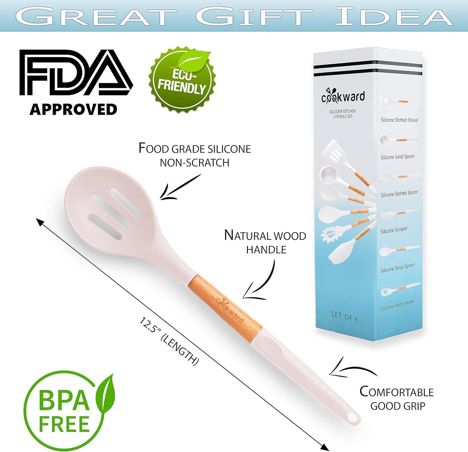 6 Pcs Cookward Silicone Cooking Utensils Set - Natural Wood Kitchen Utensils – Eco Friendly & BPA Free, Non-Scratch & Non-Stick Easy Grip -White