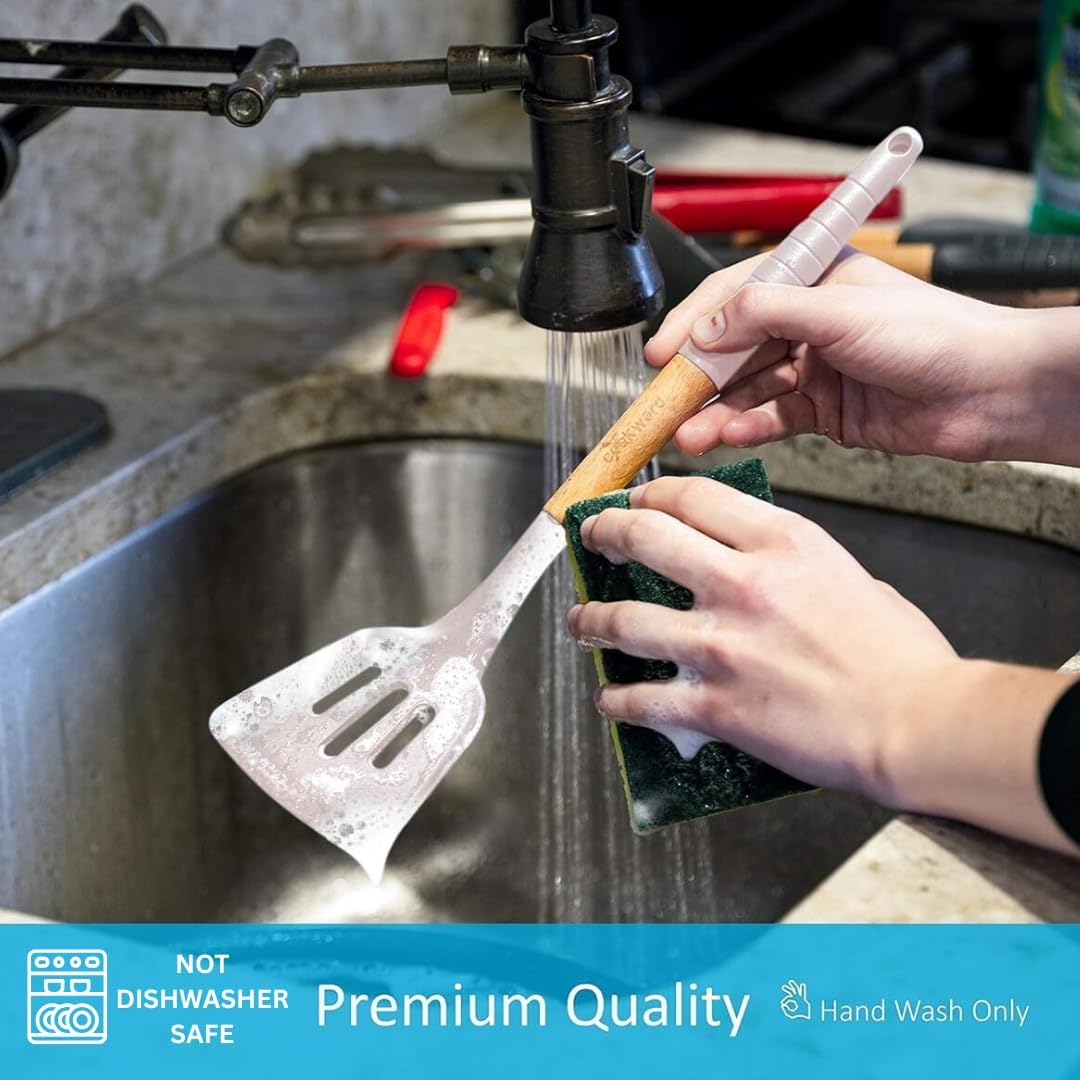 - QUALITY:The cooking tools set contains 6 premium quality kitchen utensils that are carefully crafted with food grade silicone and wood. The heat resistant silicone is free from any dangerous materials for maximum safety, and the wooden handles are very strong for unique durability do not put it in dishwasher.