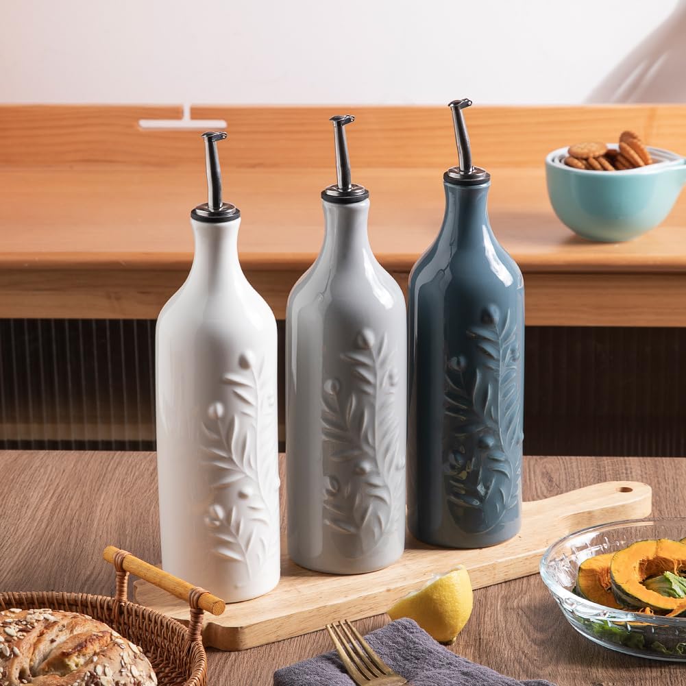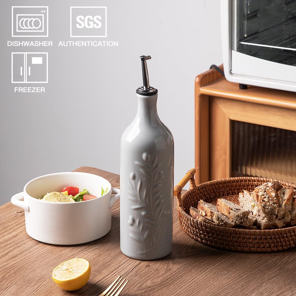 Sweejar Large Olive Oil Dispenser Bottle with Spout, 24 Oz Ceramic Oil Dispenser for Kitchen, Relief Opaque Oil Cruet, Oil Container for Cooking, EVOO, Avocado Oil, Vinegar, Pack of 1(Gray)