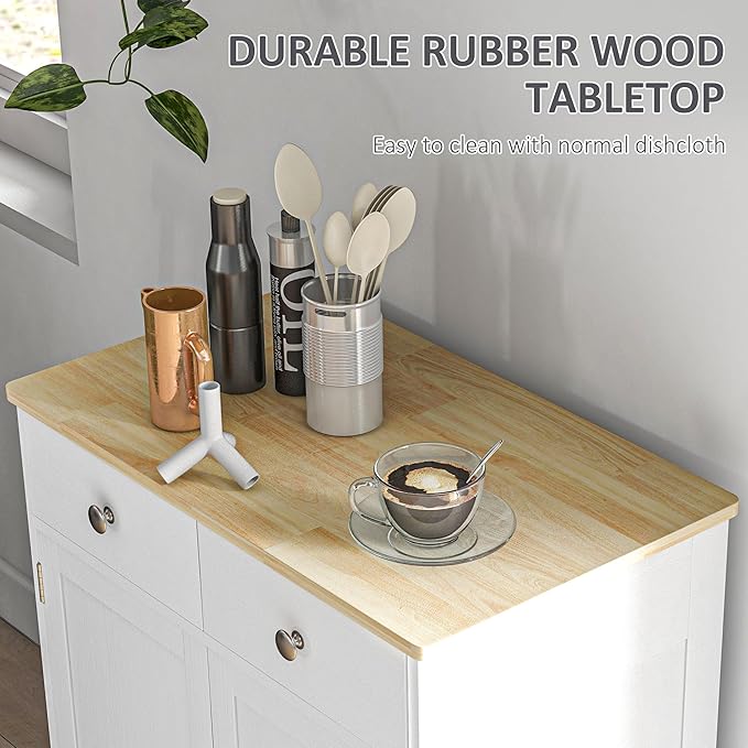 HOMCOM Sideboard with Solid Wood Countertop, Modern Kitchen Storage Cabinet, Coffee Bar Cabinet with 2 Drawers, Doors and Adjustable Shelf, Distressed White