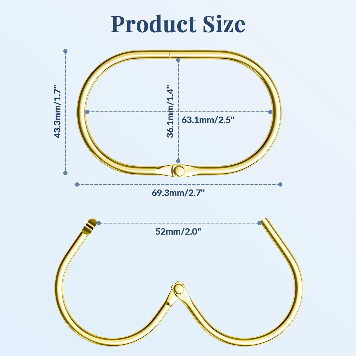 - Standard size fit: These gold shower curtain hooks are 1.4 inches wide horizontally and fits most standard size shower curtain rods. Please make sure your bathroom shower curtain rod is smaller than 1.4 inches