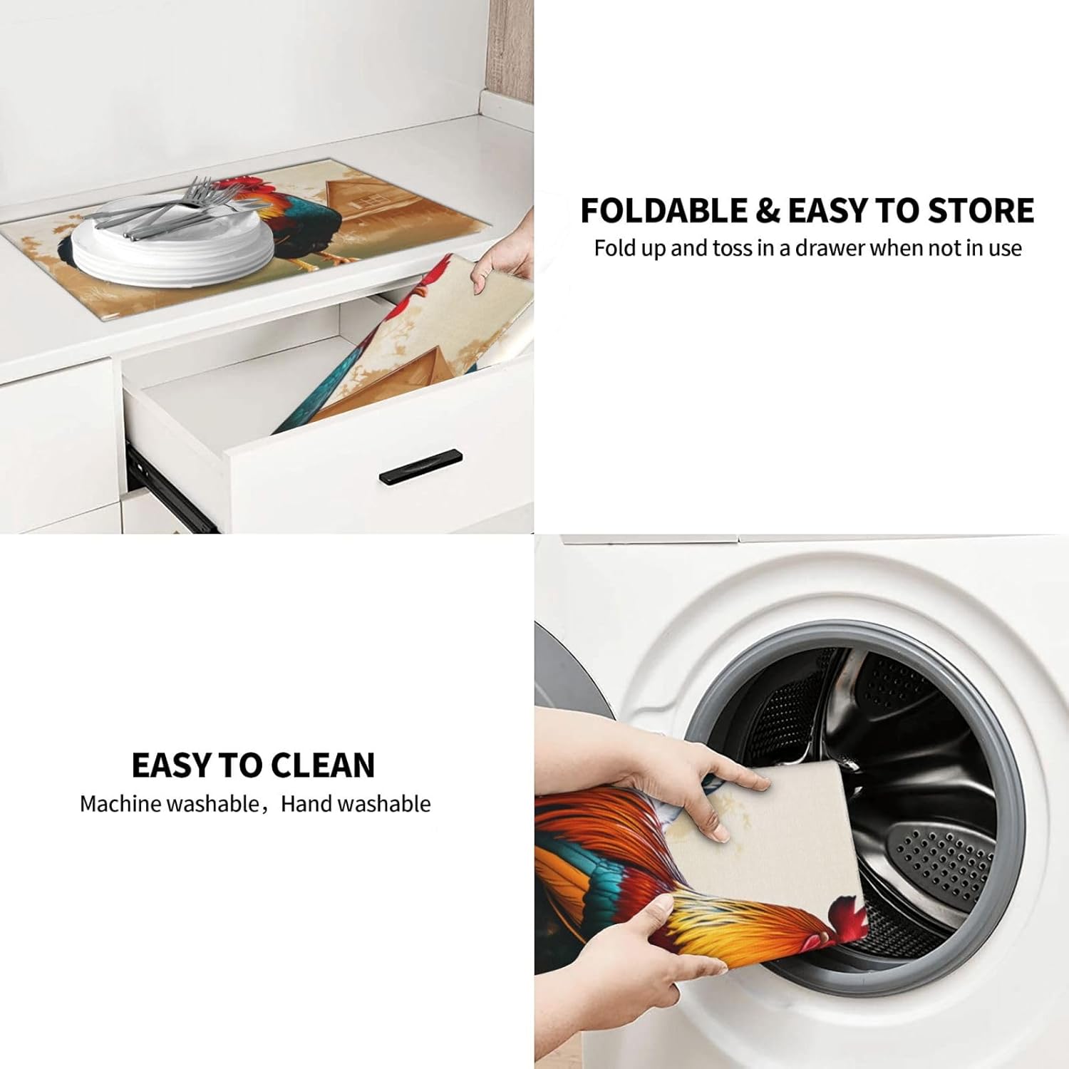 Retro Rooster Dish Drying Mat for Kitchen Counter Absorbent Microfiber Drying Mat Reusable Washable 18x24 Inch Large Dish Mats For Drying Dishes