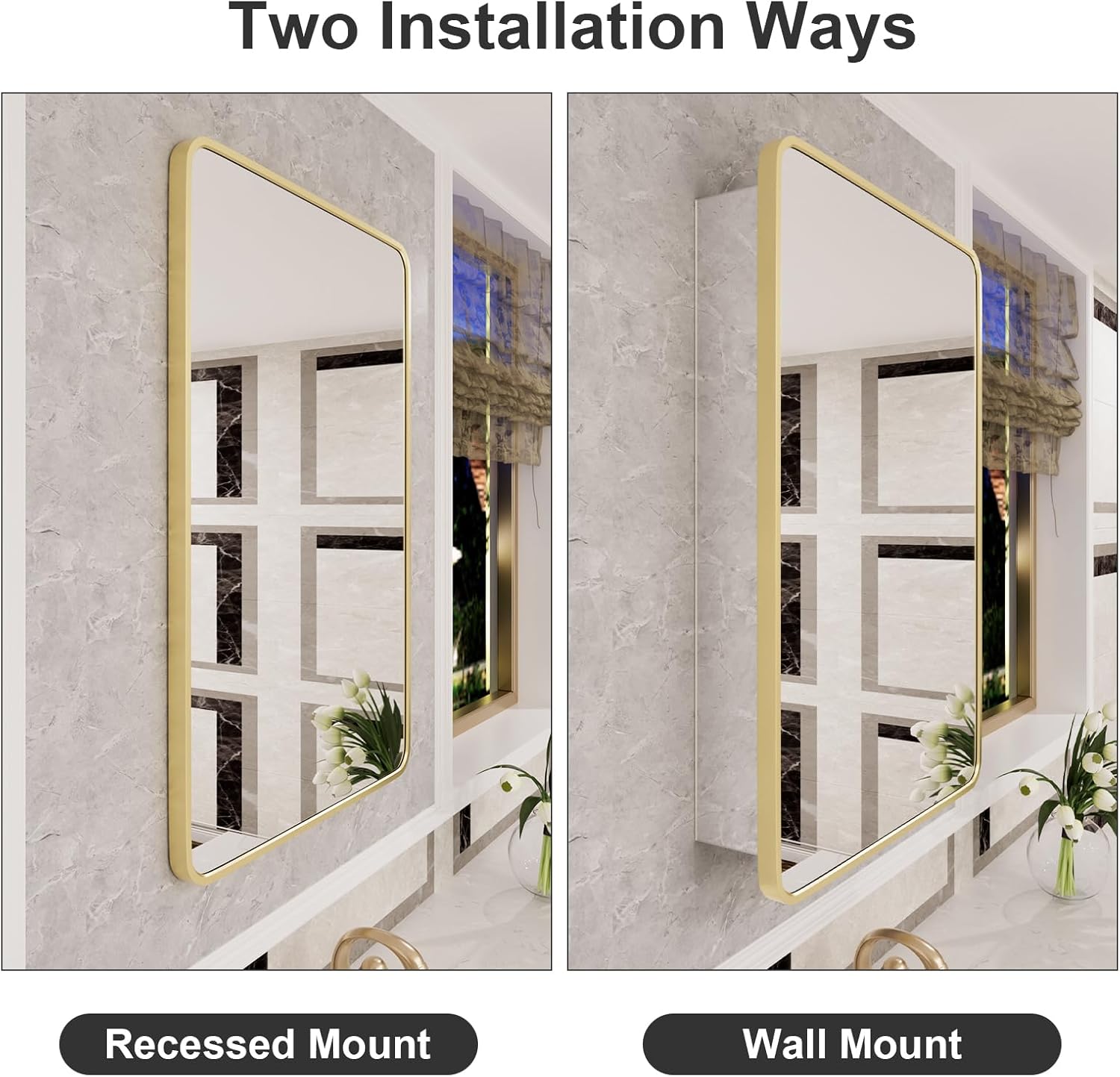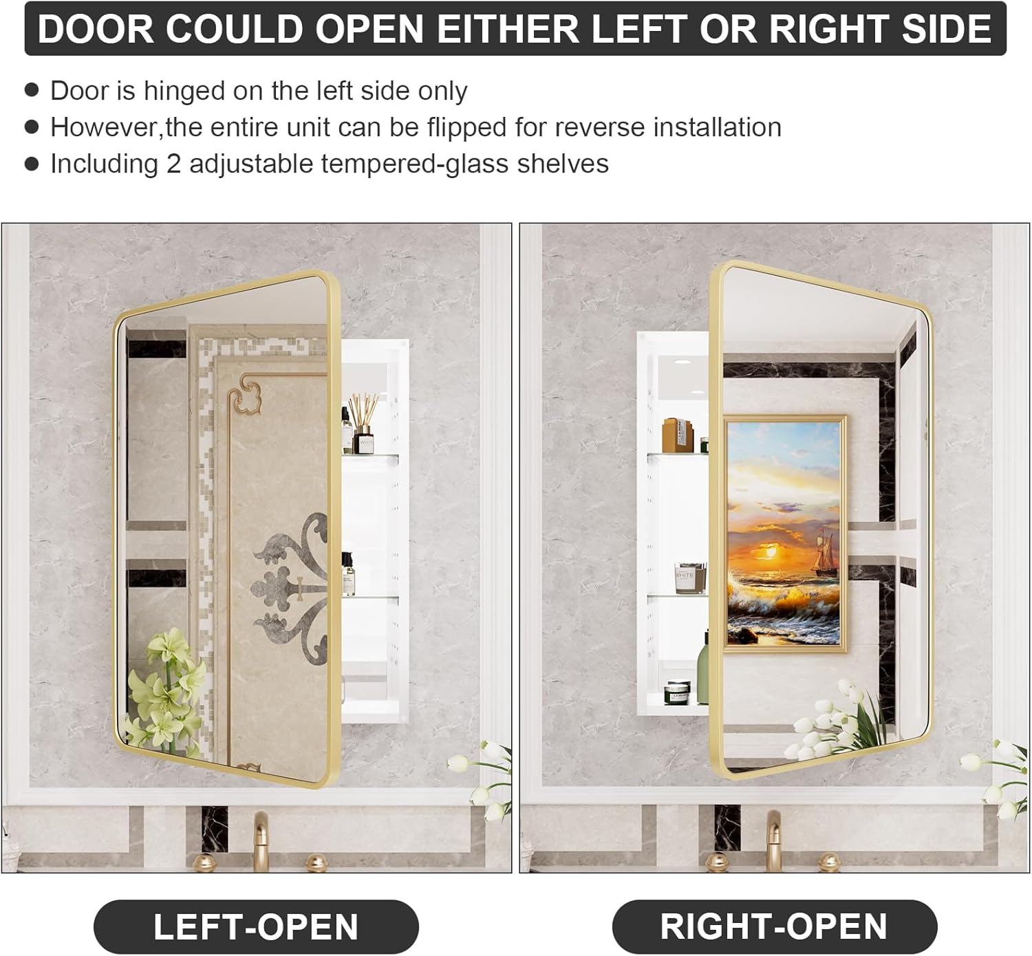 - [Both Open and Concealed Installation] Gold Medicine Cabinet with Mirror is available in both open and concealed installation; the mirror door can be opened from both left and right sides. Only the left side of the cabinet door is hinged, but the whole unit can be flipped for reverse installation.