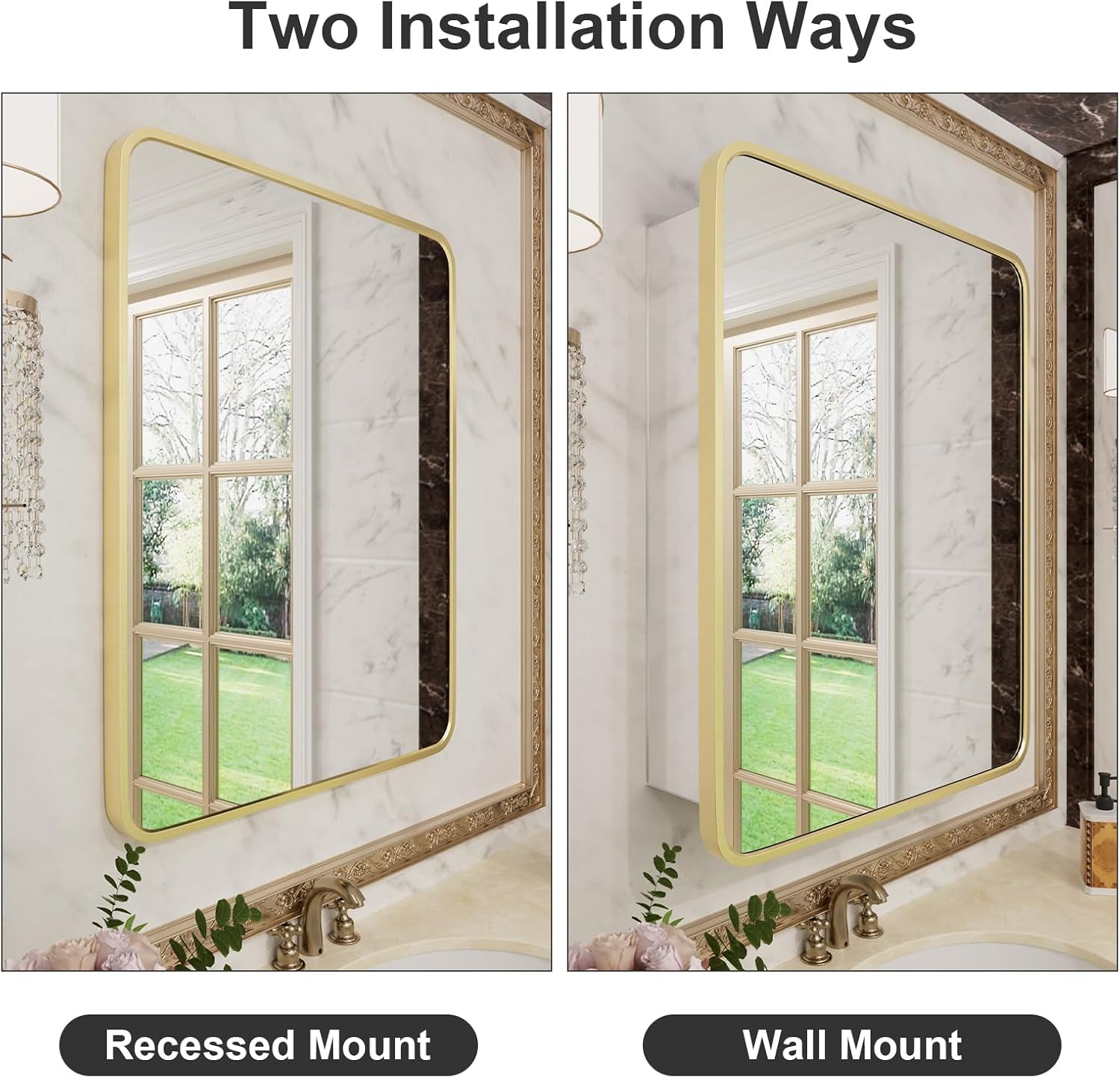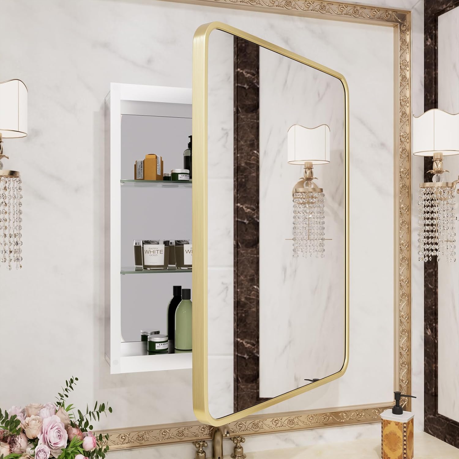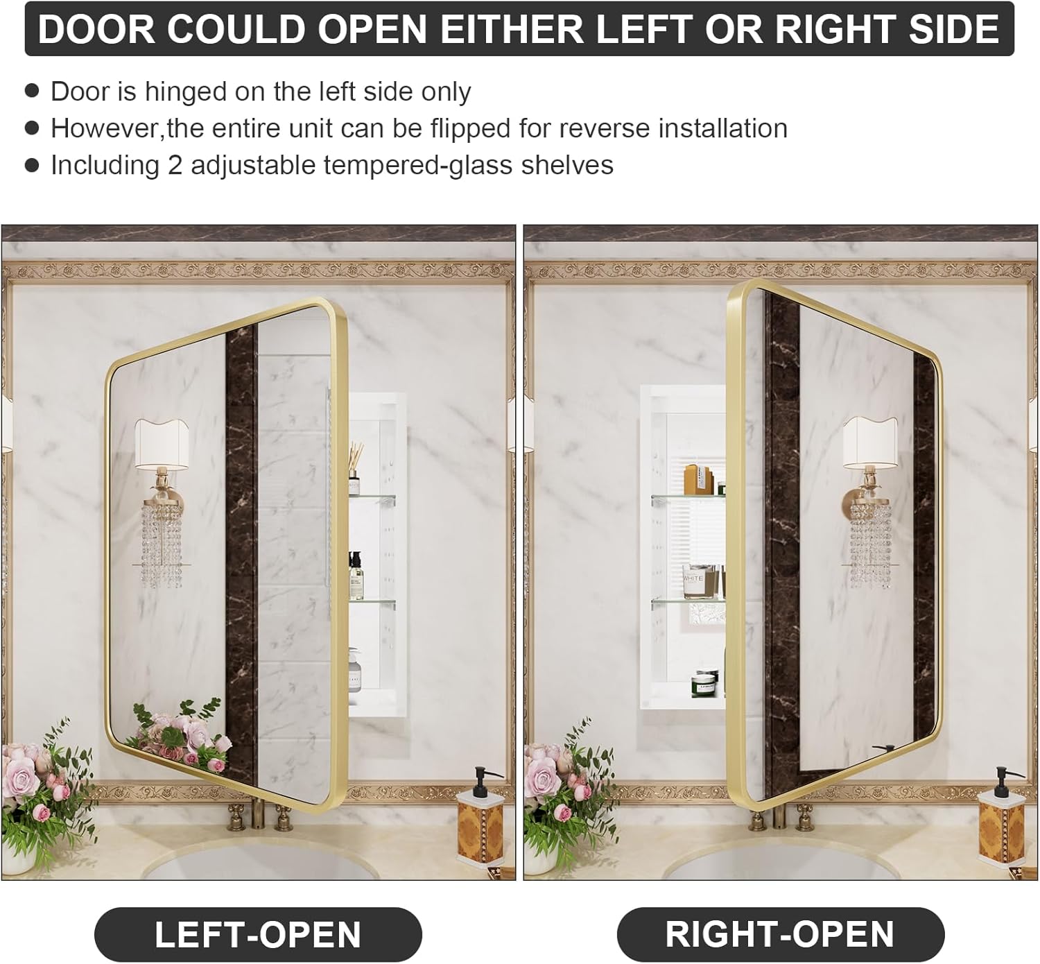 - [Both Open and Concealed Installation] Gold Medicine Cabinet with Mirror is available in both open and concealed installation; the mirror door can be opened from both left and right sides. Only the left side of the cabinet door is hinged, but the whole unit can be flipped for reverse installation.