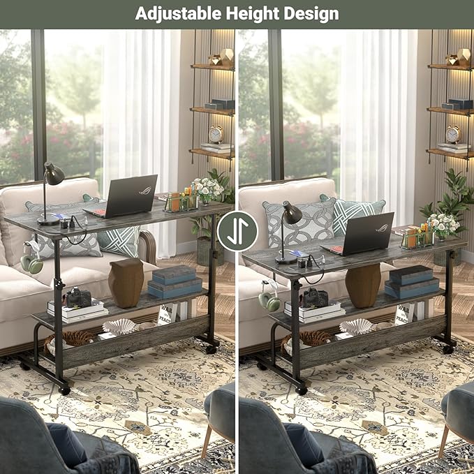 - Multi-Function: Round angle table design can improve safety during use. The rolling computer desk equipped with 4 high-quality smooth rotary wheels and 2 extra desk iron hooks, 2 tier opening storage shelves can store and display your items.