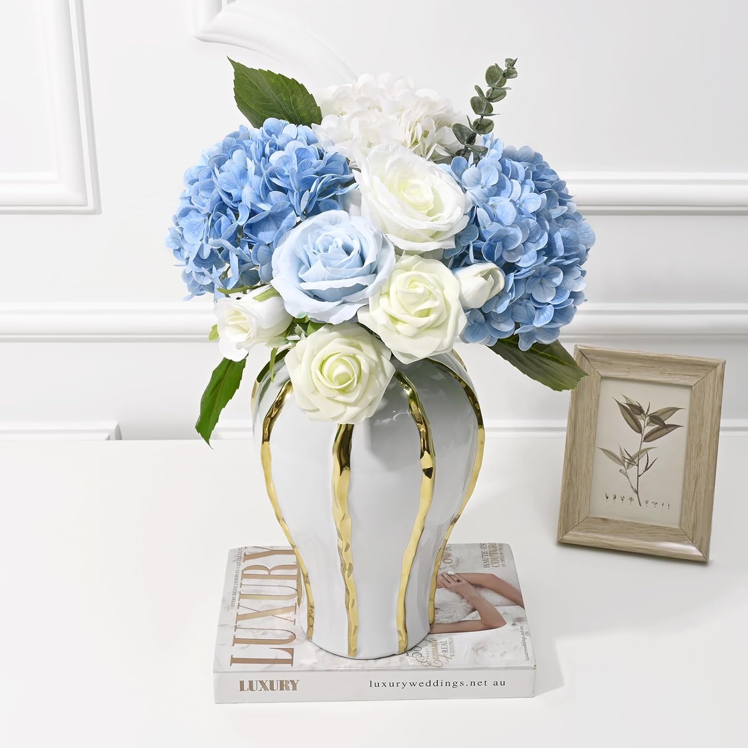 Artflower 4Pcs Real Touch Hydrangea Artificial Flowers, 22.5'' White & Blue Faux Full Latex Hydrangea Flowers for Home Floral Arrangements Wedding Bouquets Kitchen Table Centerpiece Decorations