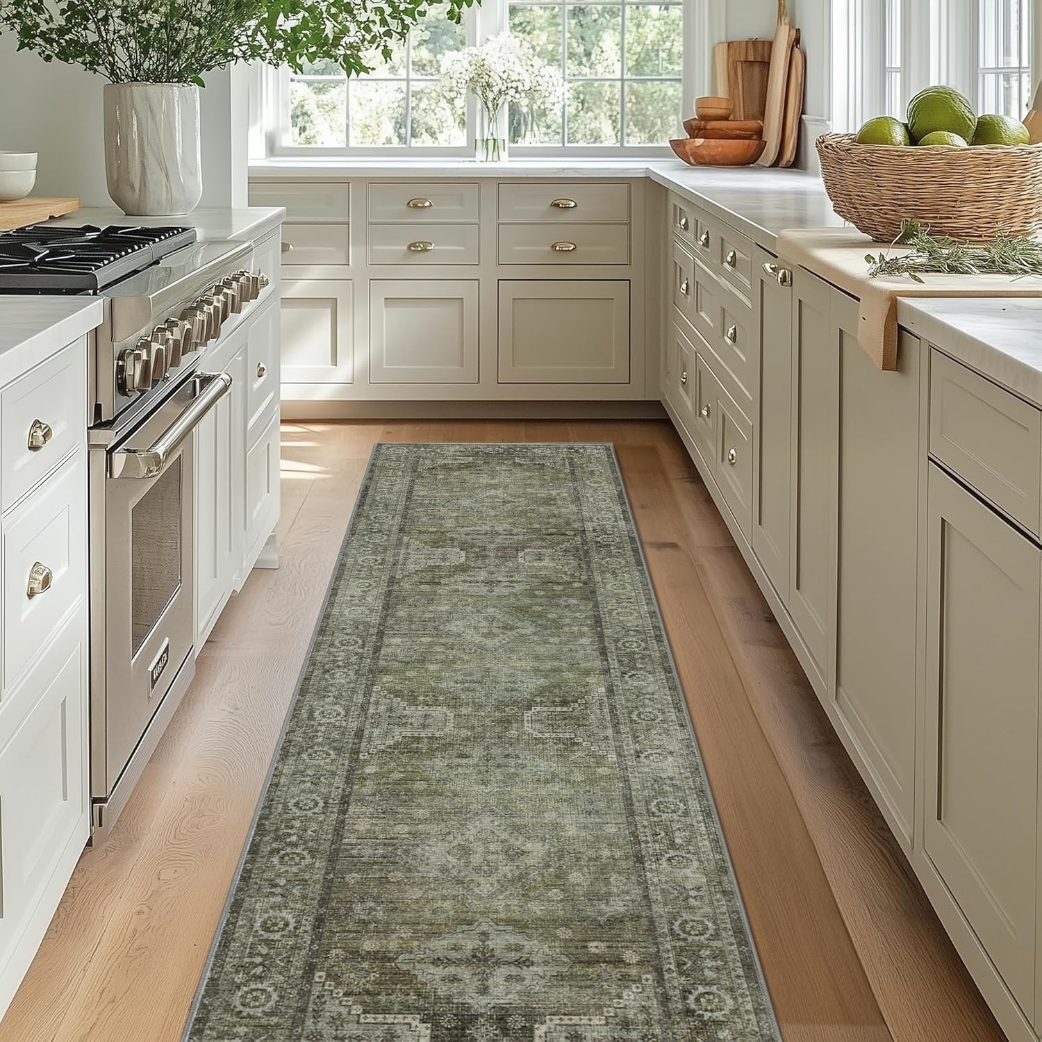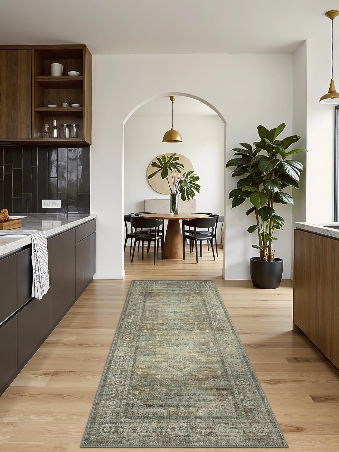 Runner Rug for Hallway Kitchen, 2x6 Machine Washable Runners Rug for Entryway, Soft Modern Boho Throw Rugs, Low Pile Floor Cover with Non Slip Backing, Distressed Light Greyish Sage Green