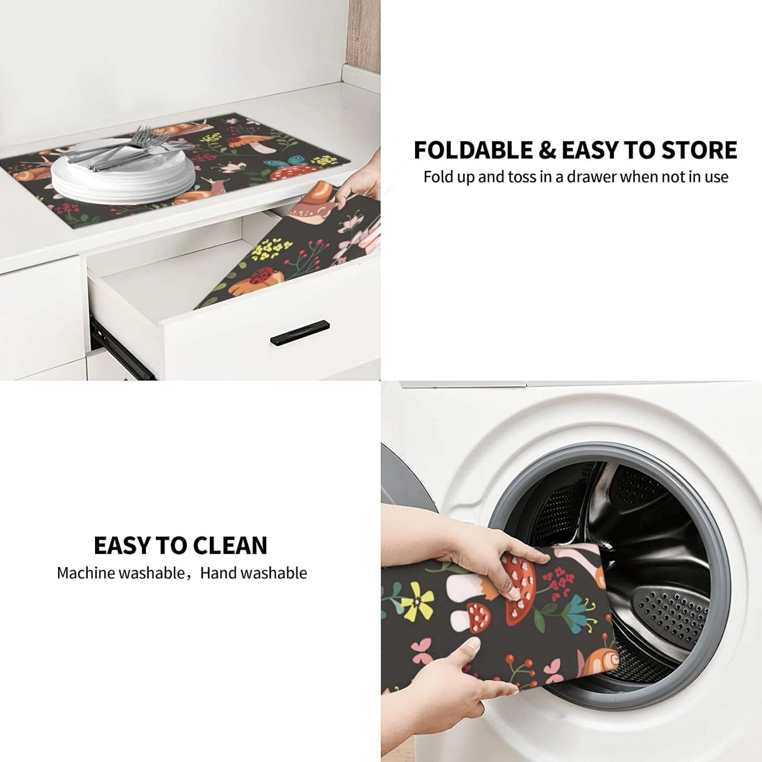 - 【Kitchen Decor】Our dish drying mat xl is one-sided fashion printing with pretty pattern, can decorate kitchen very well and change the monotonous style. No matter where you put it, it is a very beautiful decoration.