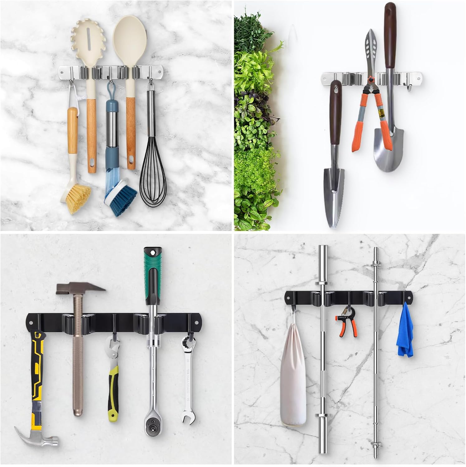 - [Easy To Use] The broom & mop storage organizer is easy to use, the grippers are flexible and can hold large and small handles, it can hold about 20 Ponds with self-adhesive ( or 50 Pounds if use screws) tools in total. Push the mop or comand broom handle into the clamps with easy after finish your household cleaning, or use the tool hangers for garage organizer wall mounted, essential garage storage & organization products of your house.