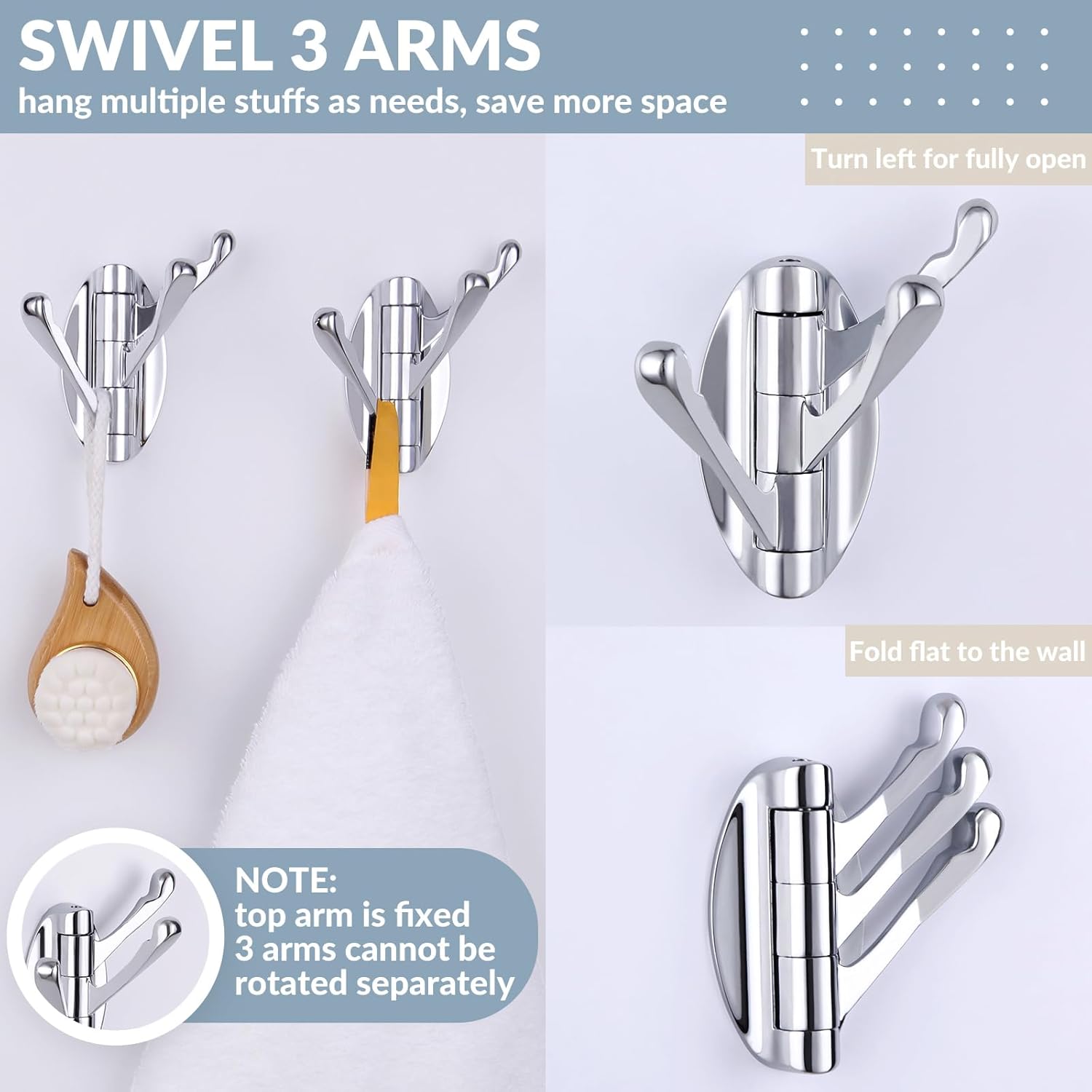 APLusee Swivel Chrome Robe Hook 2 PCS, Metal Foldable Towel Holder with Triple Rotating Arms, Heavy Duty Bathroom Kitchen Coat Hanger Wall Mounted