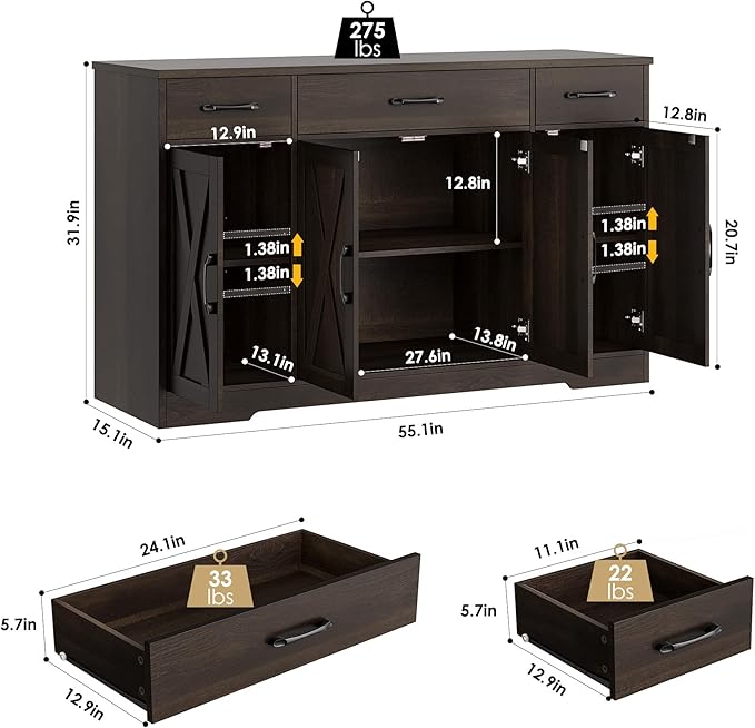 - Crafted to Last: Made of high-quality manufactured wood and smooth-gliding rails in exquisite workmanship, this kitchen buffet with drawers boasts reliable stability and durability to withstand everyday use. Overall size: 15.1"D x 55"W x 31.9"H. Weight Capacity: 300 lbs