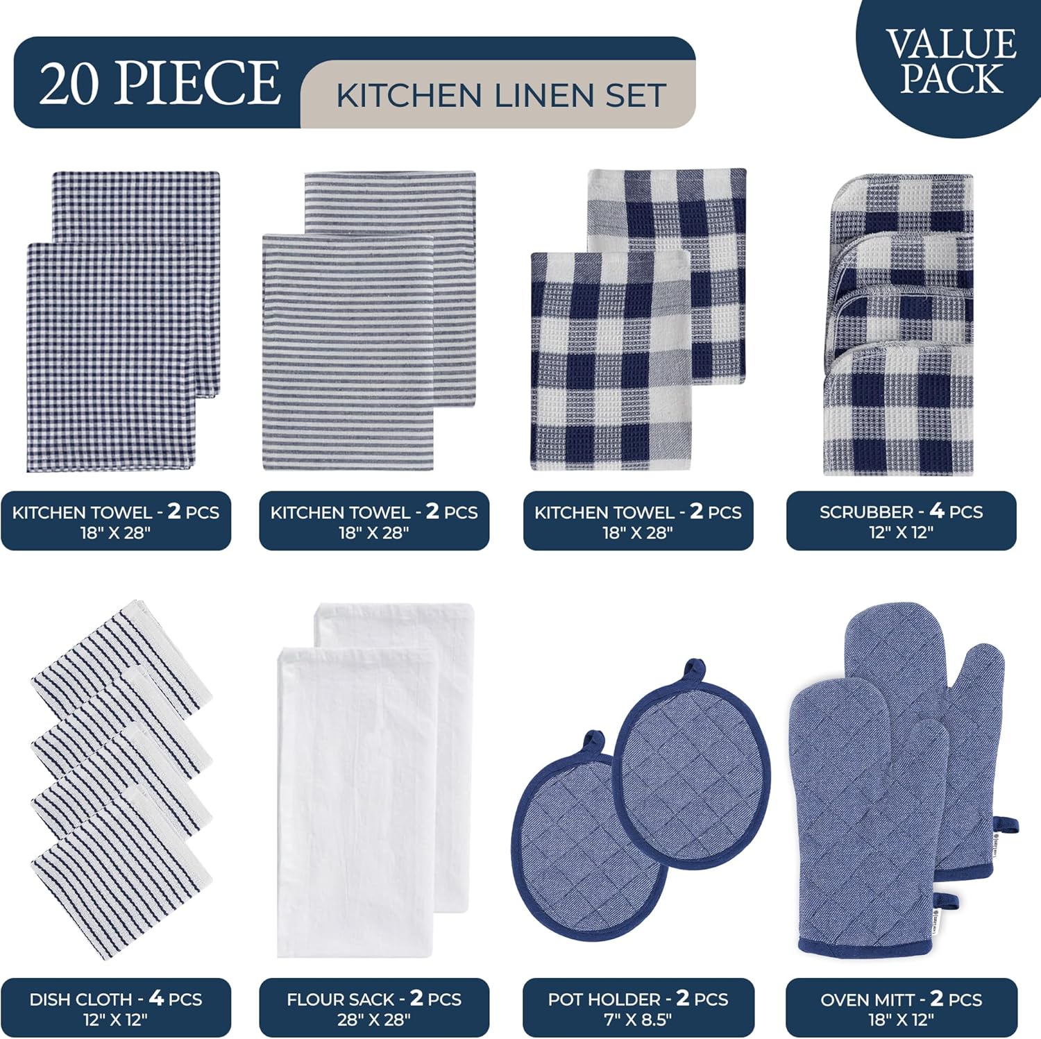 - 20-Piece Kitchen Marvel: Get more for less with our 20-piece set! Includes 6 cotton kitchen towels (16"x28"), 4 dishcloths (12"x12"), 4 dish scrubbers for washing dishes (12”x12”) 2 flour sack dish towels for kitchen (28”x28”), 2 Pot Holders, 2 Oven Mits. All 100% cotton – soft, durable, and ready to tackle any kitchen task!