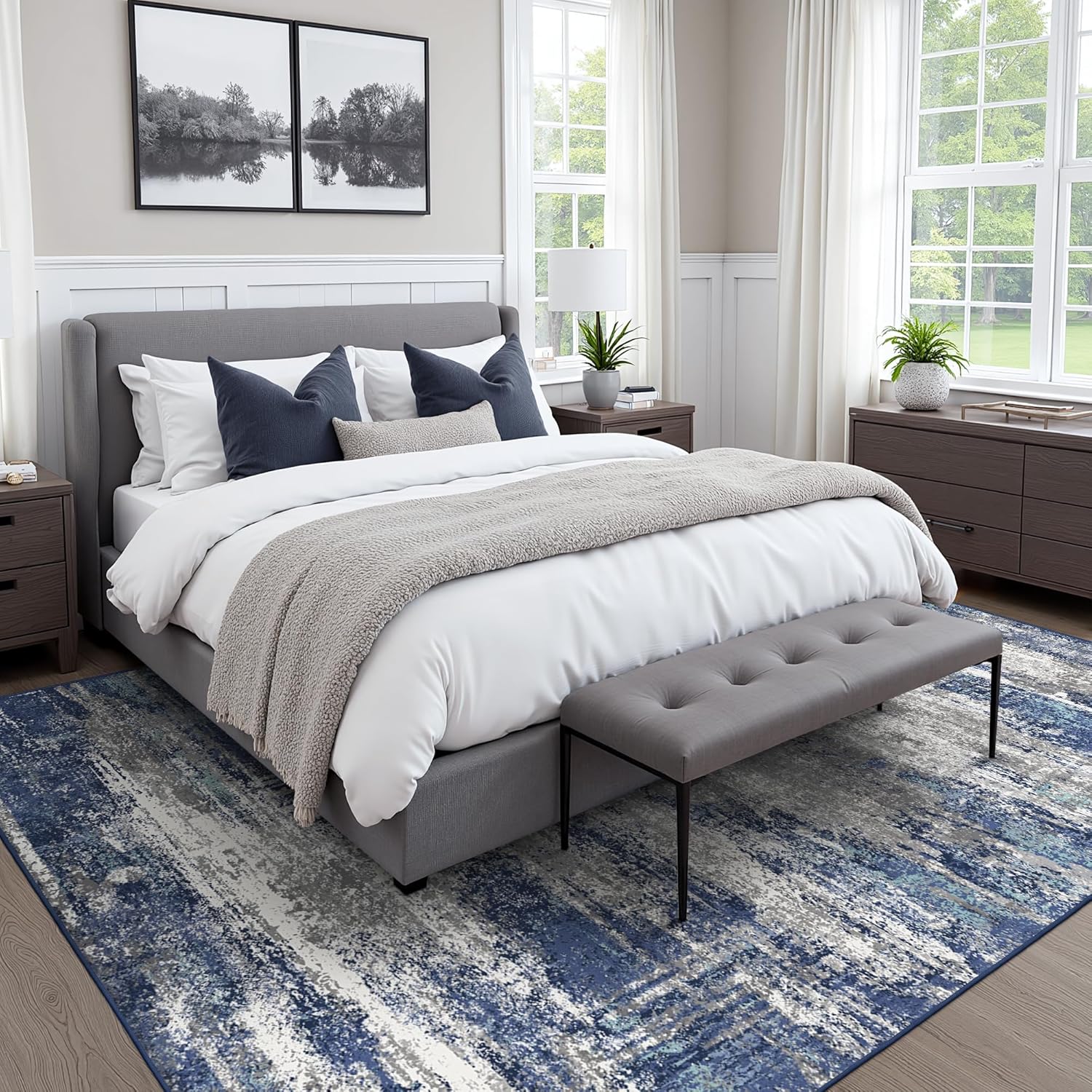 - Tender Touch: Experience the ultimate in luxury with our low-pile polyester modern 5x7 area rug, providing a cozy cushioned surface that eliminates the need for extra padding. This soft navy blue and gray abstract rug insulates your floors, creating a warm and inviting atmosphere in your living room, bedroom, dining room