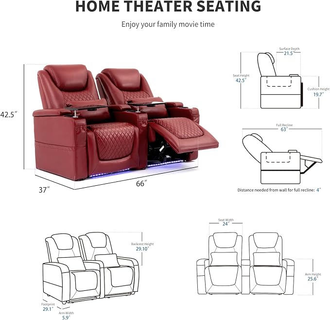 - DIMENSIONS AND SERVICE: Total size – 66(L) * 37 (W) * 42.5 (H) There are 5 boxes in total, please make sure you receive all the boxes before opening and installing. The zero-against-wall feature allows you to place the home theater seating down with only 4 inches left with the wall. If you have any questions, 7*24 professional service team will reply your solution within 24 hours