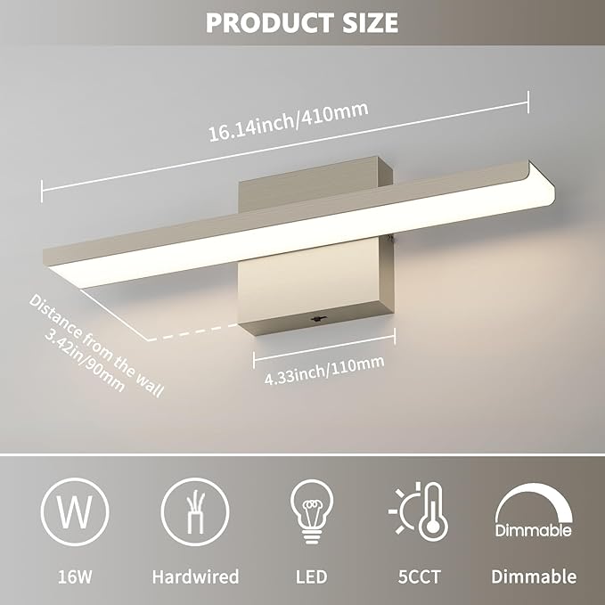 - Bathroom Light Dimension: 16.14''x3.42"x4.33”(LxWxH). 16W built-in LED chips for efficient lighting. 5 color temperature selectable and dimmable for seamless, efficient illumination.