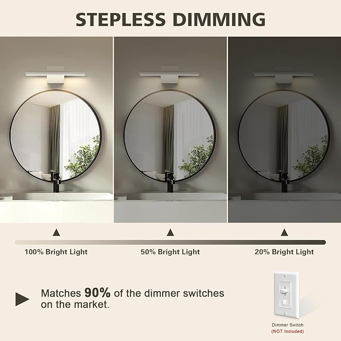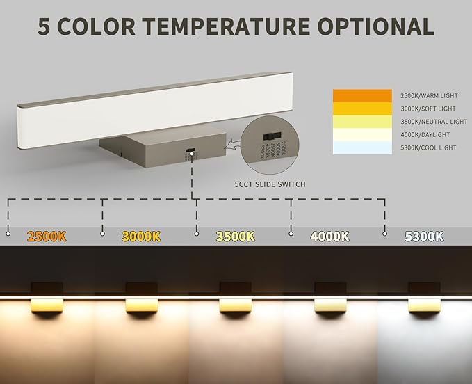 - 5CCT&Dimmable: 5 color temperature selectable (2500K/3000K/3500K/4000K/5300K) by sliding the side switch, freely choose the warm/daylight/cool light according to your need. The bathroom lights over mirror are 10-100% dimmable by the most common dimmer switches.
