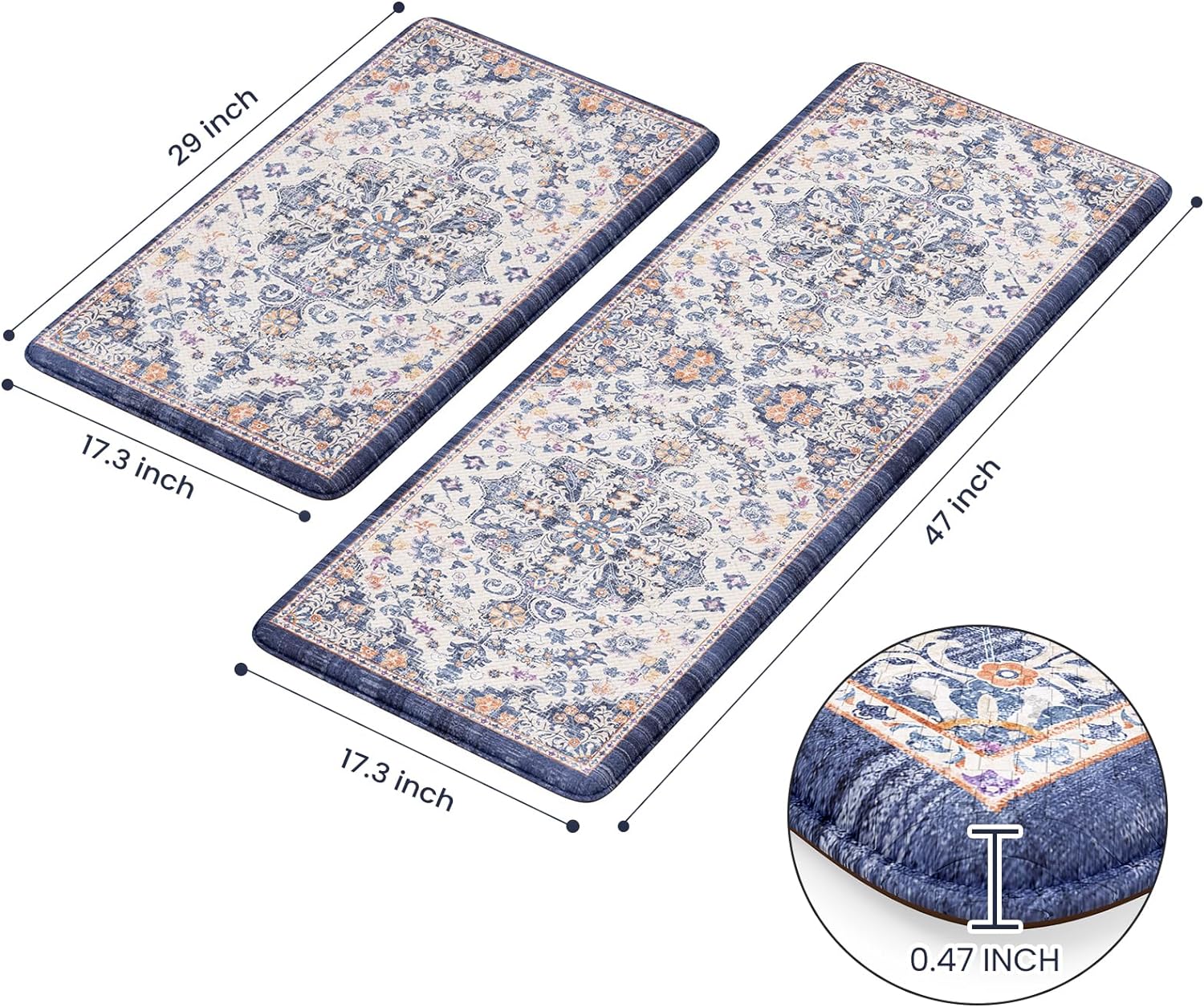 KIMODE Kitchen Mats for Floor, Boho Floral Blue Kitchen Rugs Sets of 2, Anti Fatigue Mats for Kitchen Floor, Cushioned Comfort Kitchen Floor Mats for Sink, Laundry, Desk,17"x47"+17"x29"
