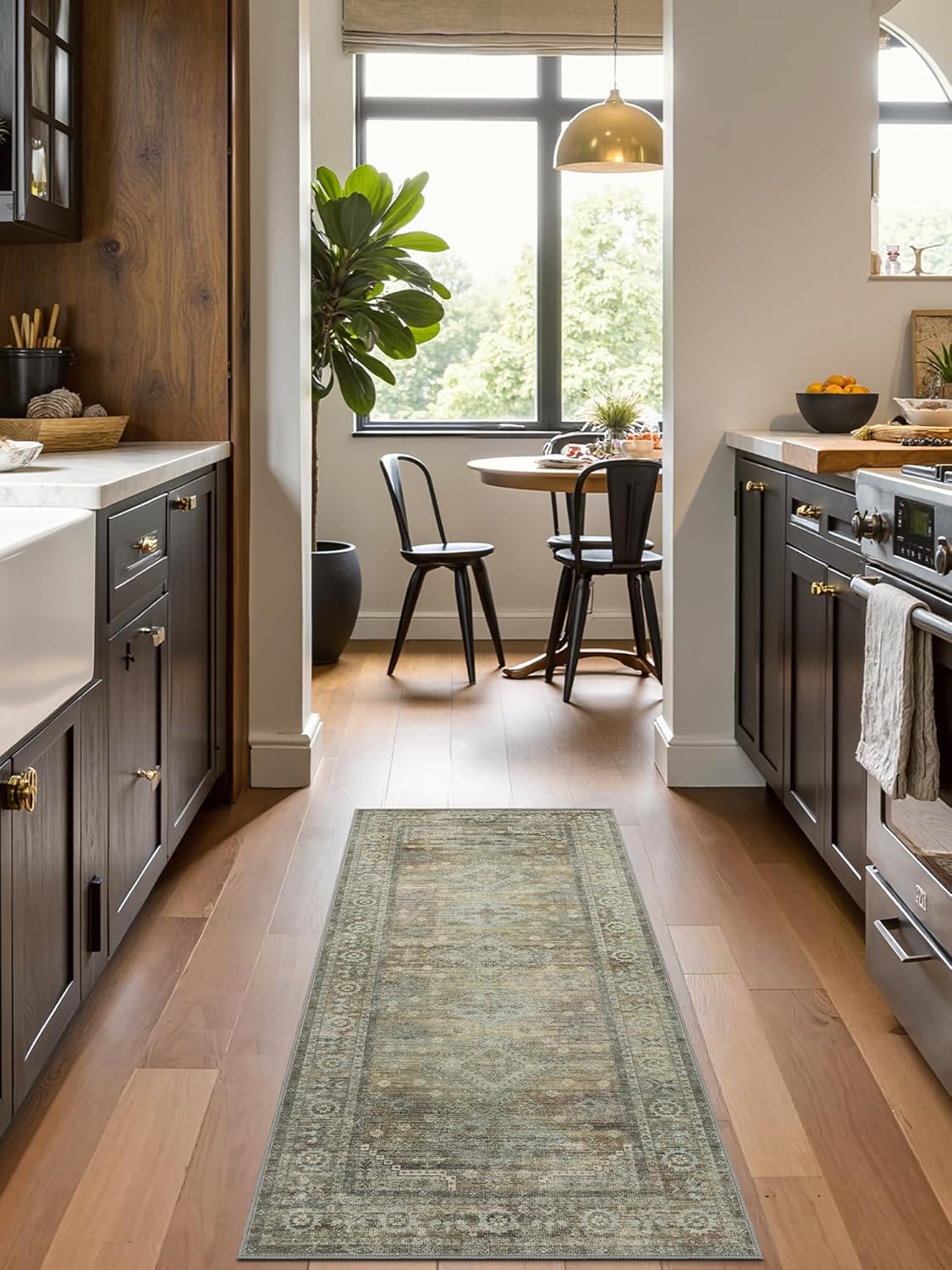Runner Rug for Hallway Kitchen, 2x5 Machine Washable Runners Rug for Entryway, Soft Modern Boho Throw Rugs, Low Pile Floor Cover with Non Slip Backing, Distressed Light Greyish Sage Green