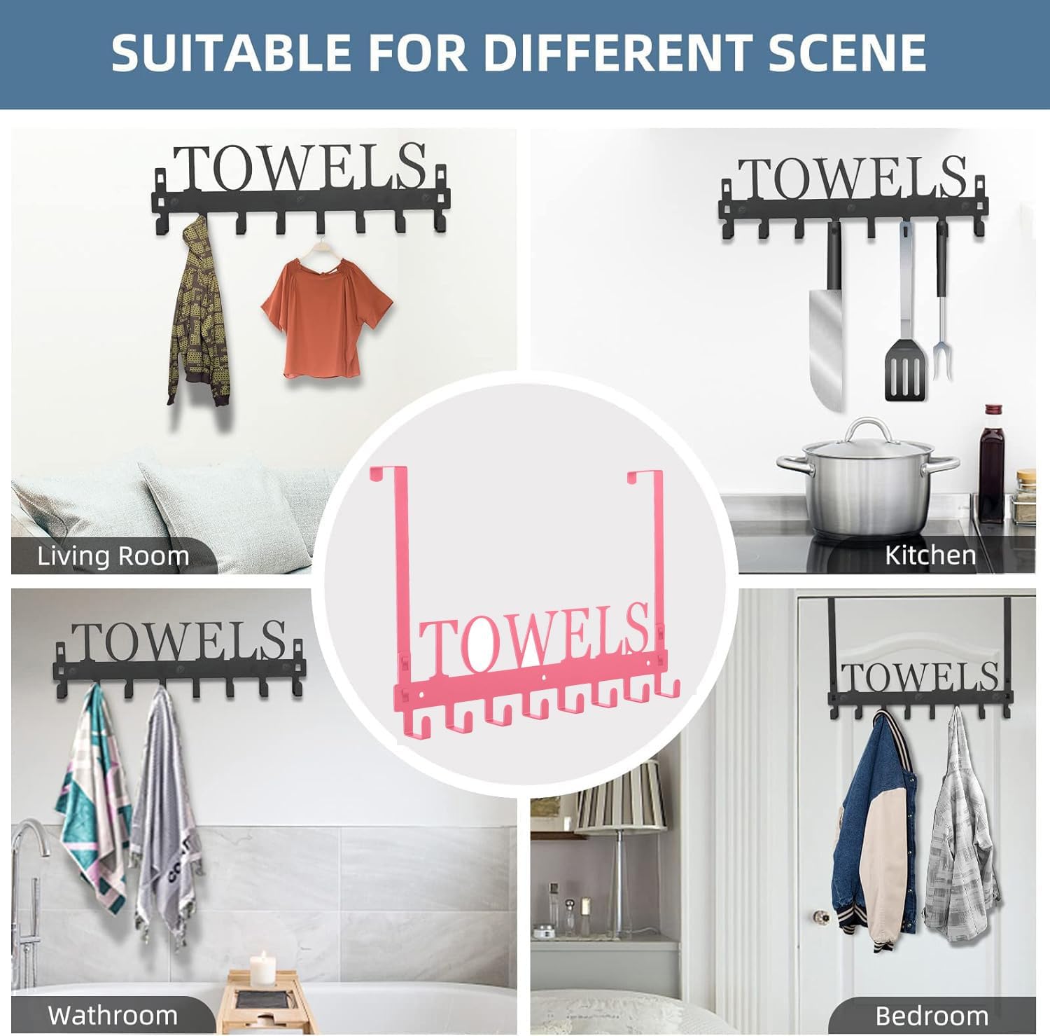 Over The Door Hooks - Wall Mount Towel Hanger with 8 Hooks for Bedroom Bathroom Pool Kitchen Towels, Bag, Coats - Pink