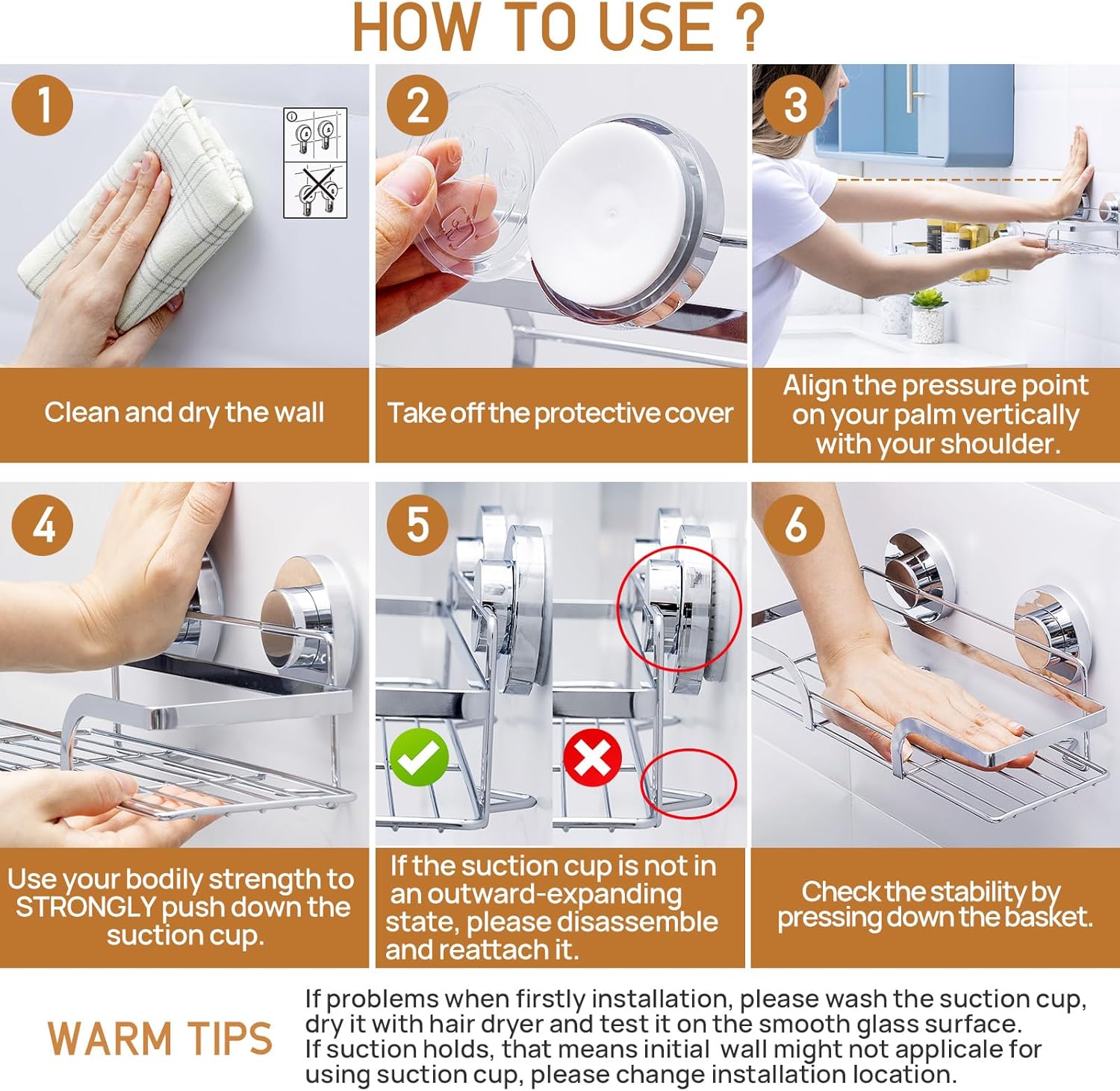 - One Second Installation & Remove: No drilling, no glue, no tools and no need to wait to apply the shower caddy. Simply choose a smooth and dry surface without any grout, take off the protective cover and push the board "PUSH" STRONGLY until you hear "PUFF", ONE second to complete the installation. The suction cup is removable without leaving any marks, so you can adjust height and position whenever you want
