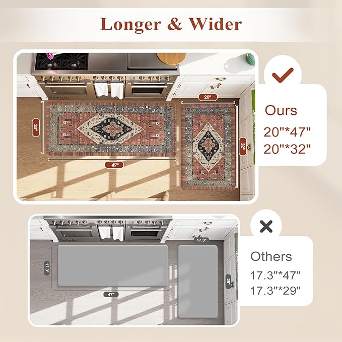 - Wider & Longer Kitchen Rugs 2PC: The set contains 2 rectangular kitchen mats measure 20"x47"+20"x32" which are wider than ordinary kitchen mats on the market.The comfort standing mat are made of high-quality and premium PVC materials,to ensure that the mats will keep their shape, even with extended and long-term heavy duty use