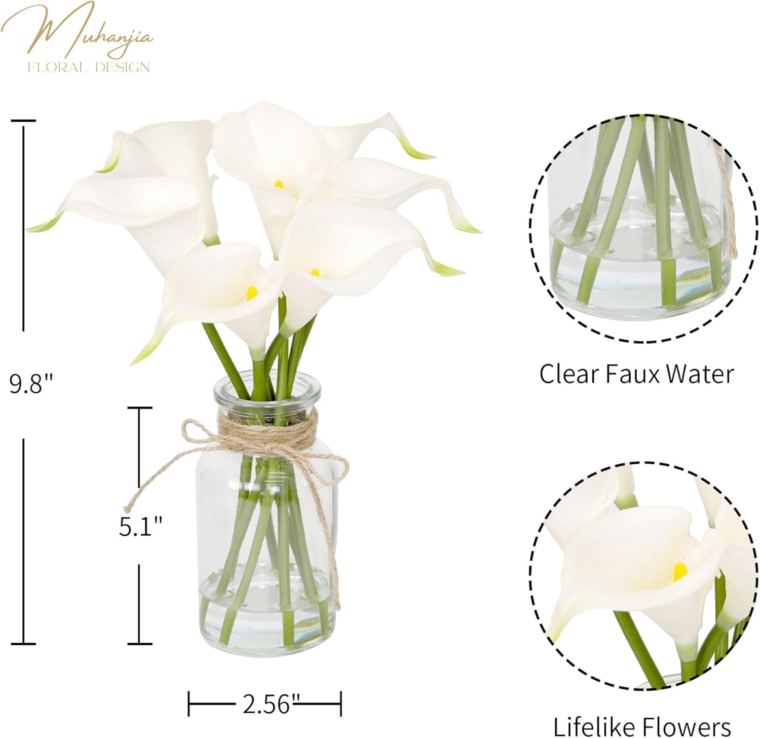 - 💗【Perfect Size】Overall:9.8 inches height, Approx 6.7 inches width. Decorative glass vase is 2.6Wx5.1H inches. This artificial calla lily flower arrangement includes 7Pcs of artificial calla lily flower real touch latex flowers.