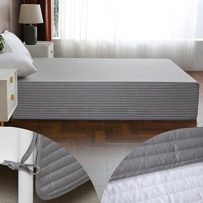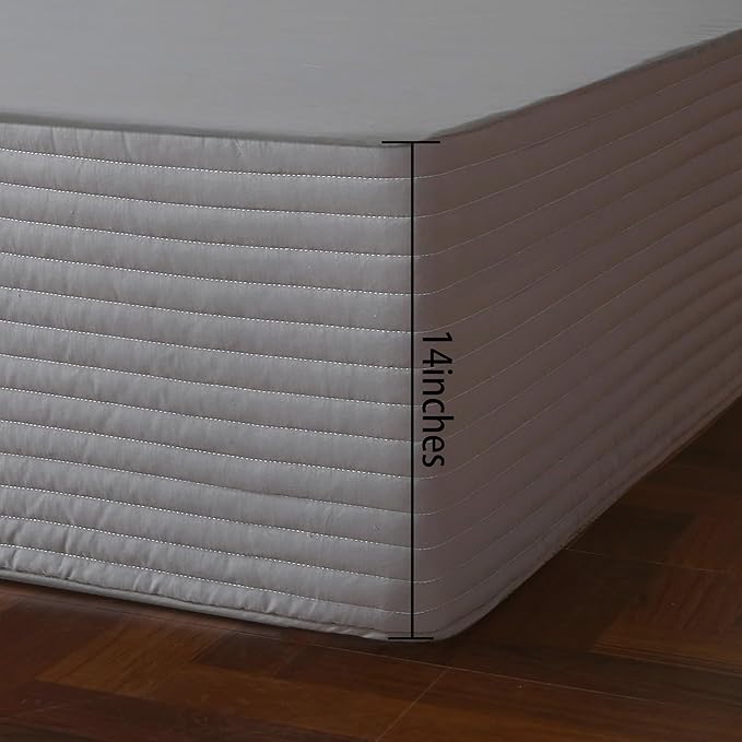 - 【Quilted Bed Skirt】:Why do you need a bed skirt?A bed skirt easily reaches the floor and can be used to hide bed springs, bed frames and legs, blocking dust and particles that can collect under the bed.This quilted bed skirt is padded for a neater,more aesthetically pleasing look and has a nice drape.Take your bed to the next level. Our tailored drop king bed skirt hides your bed legs and frame along with letting you use the storage space under your bed. Our king size bed skirts are made with the same fabric throughout, so there is no unsightly white base like other dust ruffles.
