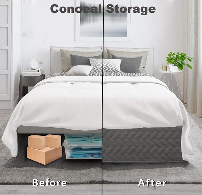 - 【Quilted Bed Skirt】:Why do you need a bed skirt?A bed skirt easily reaches the floor and can be used to hide bed springs, bed frames and legs, blocking dust and particles that can collect under the bed.This quilted bed skirt is padded for a neater,more aesthetically pleasing look and has a nice drape.Take your bed to the next level. Our tailored drop king bed skirt hides your bed legs and frame along with letting you use the storage space under your bed. Our king size bed skirts are made with the same fabric throughout, so there is no unsightly white base like other dust ruffles.