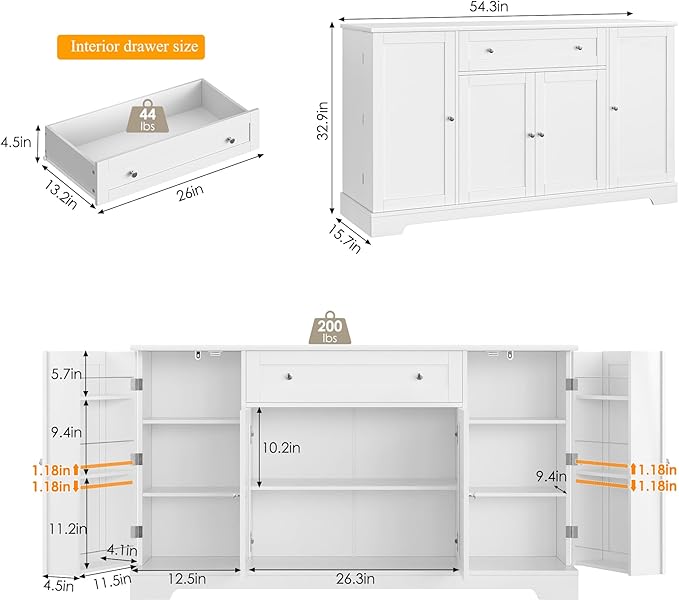 HITHOS 54" Buffet Cabinet with Storage, Modern Kitchen Buffet Sideboard with Drawer, Wood Coffee Bar Station with Adjustable Shelves, Kitchen Storage Cabinet for Living Room, White