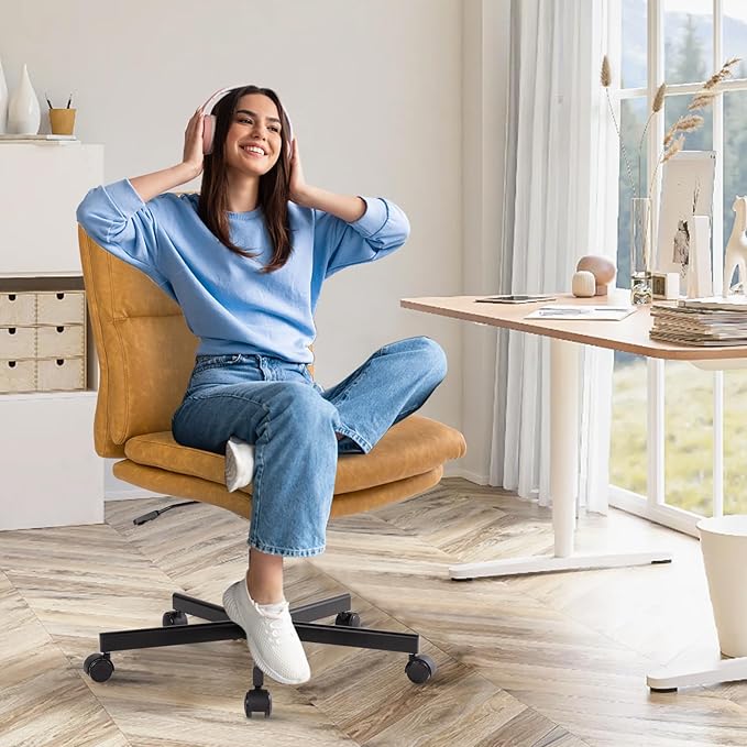 LUCKWIND Armless Office Desk Chair with Wheels, Double Padded PU-Leather Chairs, Mid-Back Criss Cross Swivel Task Chair, Height Adjustable Cushioned Vanity Chair for Home, Office & Bedroom (Yellow)