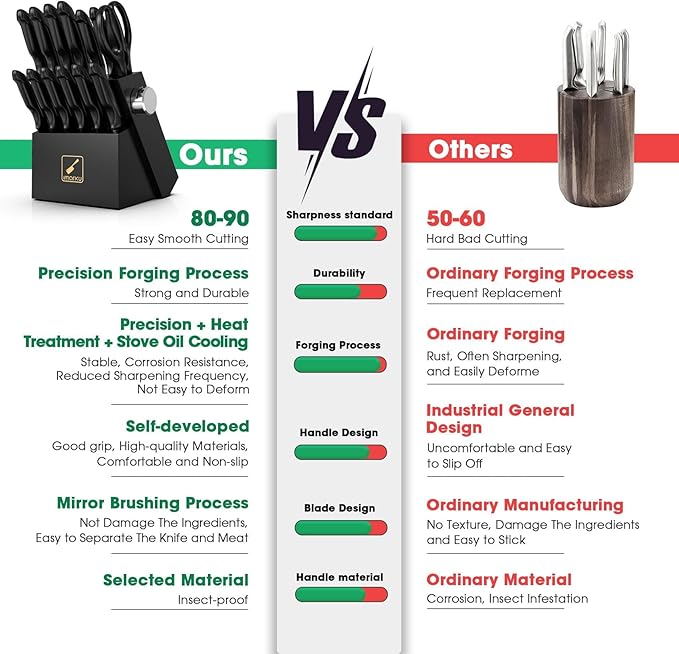 - Easy to Clean and Maintain: Cleanup is a breeze with our dishwasher-safe knife set. To maintain their sharpness, we recommend a quick rinse and gentle hand washing. The knife block can be easily wiped down to keep your storage area neat and organized