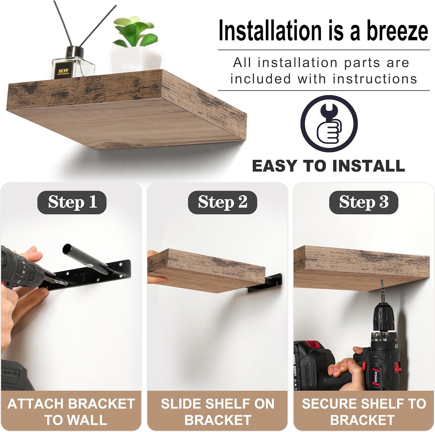 - Easy To Install Book Shelves: Our small floating shelves are made of beautiful faux wood with a smooth matte finish (not solid wood). Minor assembly is required. Attaches firmly to the wall. Mounting hardware is included. Wipe clean with a dry cloth. Supports up to 8 pounds per shelf